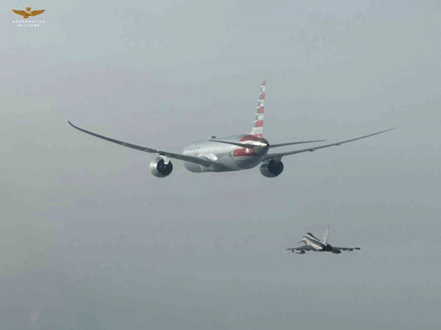 ABD’nin New York kentinden Hindistan’ın başkenti Yeni Delhi’ye giden American Airlines’a ait yolcu uçağı, bomba tehdidi nedeniyle İtalya’nın başkenti Roma’ya iniş yaptı. Uçağa İtalyan Hava Kuvvetleri’ne ait iki Eurofighter Typhoon savaş uçağı eşlik etti.