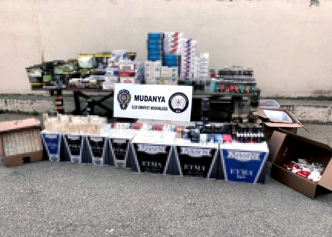 Bursa’nın Mudanya ilçesinde polis ekiplerinin ruhsatsız iş yerine yaptığı operasyonda yüzlerce paket sigara ve sigara yapımında kullanılan tütün mamulleri ele geçirildi.