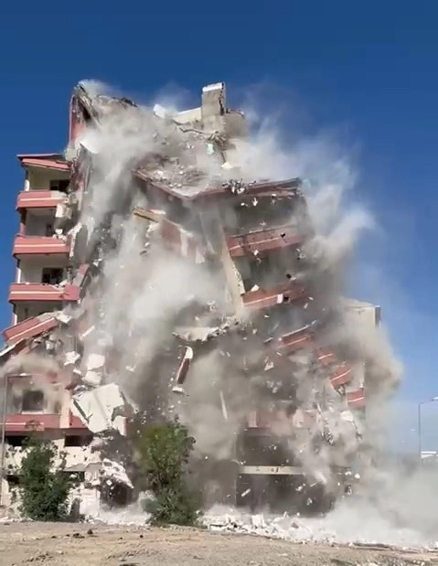 6 Şubat’ta Kahramanmaraş’ta meydana gelen yıkıcı depremlerden etkilenen iller arasından bulunan Elazığ’da ağır hasarlı binaların yıkımı devam ediyor. Bu çerçevede, merkeze bağlı Akpınar Mahallesinde yıkımına başlanan 6 katlı bina, iş makinesinin makasını vurmasıyla bir anda yerle bir oldu. Ortalık toz bulutu ile kaplanırken o anlar cep telefonu kamerasına saniye saniye yansıdı.