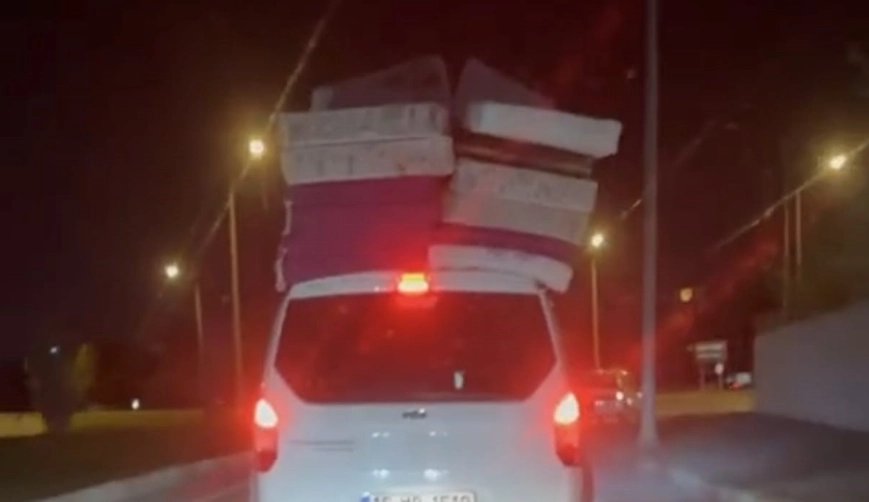 Bursa’nın İnegöl ilçesi İtfaiye Kavşağı’ndan İstiklal Caddesi'ne seyreden hafif ticari aracın üzerine yüklenen yataklarla seyrettiğini gören sürücüler hayrete düştü. O anlar bir sürücü tarafından cep telefonu kamerası ile görüntülendi.