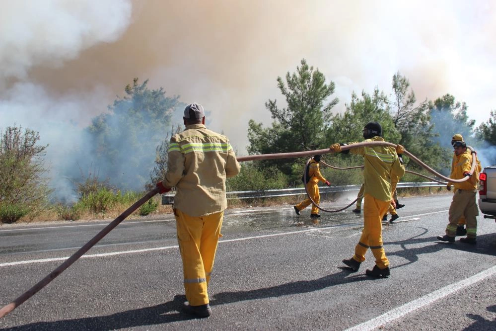 İzmir'in Menderes ilçesinde ormanlık alanda çıkan yangına ekipler havadan ve karadan müdahale ederken, alevlere müdahale eden ekip sayısı artırıldı. Yangın saat 14.00 sıralarında ilçeye bağlı Keler Mahallesi mevkiinde bulunan ormanlık alanda meydana geldi. İhbarın hemen ardından İzmir Orman Bölge Müdürlüğüne bağlı 8 uçak ve 16 helikopter ile havadan, 25 arazöz, 6 su ikmal aracı, 7 dozer, 7 ilk müdahale aracı ile alevlere müdahale ediyor. Ekiplerin alevleri kontrol altına almak için başlattığı mücadele sürüyor.