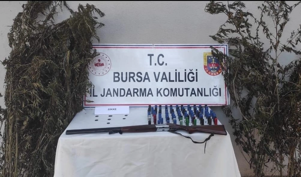 Bursa İl Jandarma Komutanlığı ekipleri tarafından yapılan çalışmalar neticesinde K.A. (44) isimli şüphelinin Hayriye Mahallesi'nde bulunan arazisinde yasadışı kenevir ekimi yaptığı ve kurutarak sattığı tespit edildi. Şahsın Yenişehir ilçe merkezinde bulunan ikametini tespit eden ekipler, baskın yaparak şüpheliyi gözaltına aldı. Şüphelinin iş yeri ve arazisinde yapılan aramalarda ise, boyları 1 ve 2.5 metre arasında değişen kurumaya bırakılmış 24 kök kenevir bitkisi, 1 adet ruhsatsız av tüfeği, 71 adet 12 kalibre av tüfeği fişeği, 7 adet çeşitli dönemlere ait sikke ele geçirildi. Ayrıca şüphelinin iş yerinde yapılan kontrolde 5 Afgan uyruklu şahsın çalışma izni olmadan çalıştığı tespit edilerek, iş yeri sahibi ve çalışanlarına idari para cezası uygulandı. Karakolda işlemleri tamamlanan K.A. sevk edildiği adliyede çıkarıldığı mahkemece adli kontrol şartıyla serbest bırakıldı.