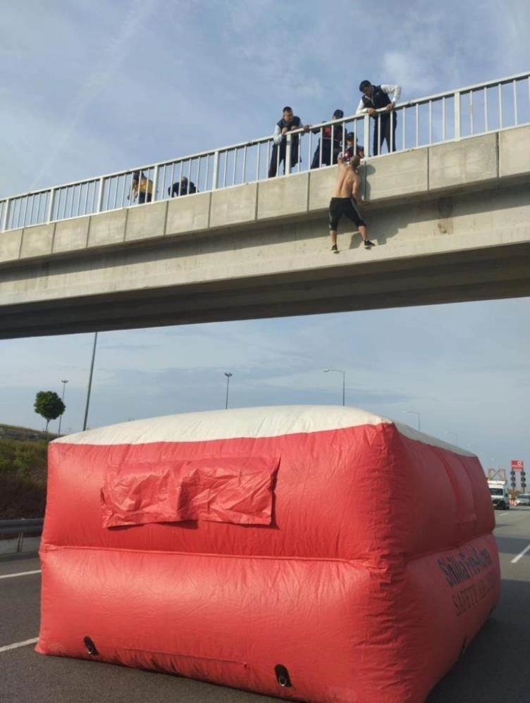 Olay, İstanbul-İzmir Otoyolu Bursa MustafaKemalPaşa Adaköy Konakoğlu Oksijen Tesisleri üst geçidinde meydana geldi. Edilin bilgiye göre, psikolojik sorunları olan vatandaş, köprünün üzerine çıkarak altından geçen araçların arasına atlamak istedi. Birinin köprüden sarktığını fark eden vatandaşlar, durumu güvenlik ekiplerine haber verdi. Olay yerine gelen jandarma ekipleri yolu trafiğe kapattı. İtfaiye ekipleri de şahsın atlama ihtimali olan yere şişme yatak açtı. Aşağı atlayan şahıs, açılan şişme yatak sayesinde kurtuldu. Kısa süreliğine trafiğe kapatılan yol açılırken, jandarma ekiplerinin olayla ilgili tahkikatı sürüyor.