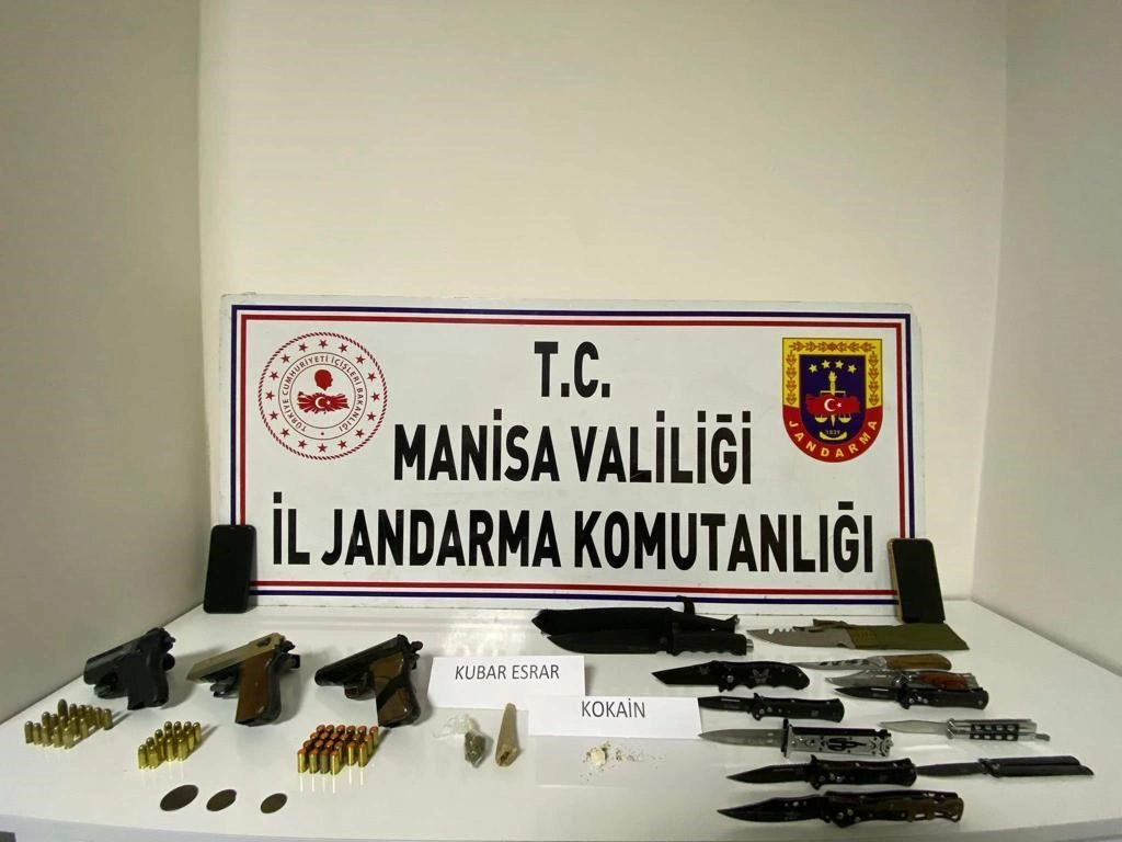 Uyuşturucu veya uyarıcı madde ticareti yapan, nakleden ve kullanan şahıslara yönelik yapılan çalışmalar kapsamında İl Jandarma İstihbarat ve KOM Şube Müdürlüğü, Narkotik Köpek Unsuru ve Salihli İlçe Jandarma Komutanlığı ekipleri, C.T.(33) ve H.T.(37) şüpheli şahısların üst, araç ve ikametlerinde arama yaptı. Yapılan aramada 5 gram taş kokain, 10 gram kubar esrar, 1 adet 7.65 mm Baretta marka tabanca, 30 adet 7.65 mm fişek, 2 adet kuru sıkı tabanca, 22 adet kuru sıkı fişek, 6 adet sustalı bıçak, 2 adet kelebek bıçak, 2 adet kasatura, 3 adet sikke ve 2 adet cep telefonu ele geçirildi. Şüpheliler hakkında adli işlem başlatıldığı öğrenildi.