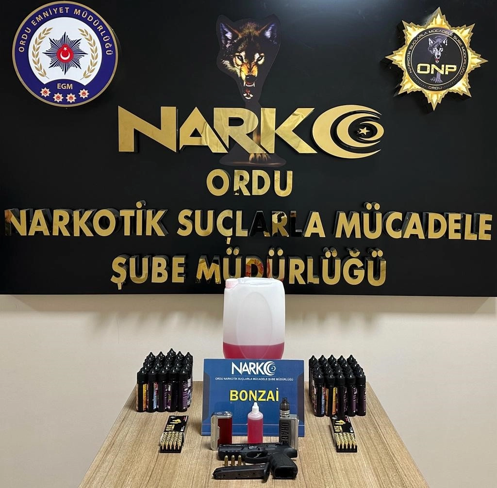 İl Emniyet Müdürlüğü Narkotik Suçlarla Mücadele Şube Müdürlüğü ekipleri, uyuşturucu madde ticareti yapanlara yönelik Ordu, İstanbul ve Giresun illerinde eş zamanlı operasyon düzenledi. Operasyon çerçevesinde şüphelilerin ikamet ve üzerlerinde yapılan aramalarda 60 parça elektronik sigara doldurma aparatı içerisinde toplam 6 kilo 250 gram likit bonzai olarak değerlendirilen sıvı madde, 156,60 gram esrar, 2,85 gram metamfetamin, 4 adet elektronik sigara içerisinde likit bonzai, 1 adet ruhsatsız tabanca ve tabancaya ait şarjör ile 103 adet tabanca mermisi ele geçirildi. Operasyonda O.K. (40), A.Ş. (45), A.K. (37), A.Ş. (52), Ö.K. (41) ve M.E. (47) isimli şüpheliler gözaltına alındı. O.K., emniyetteki işlemlerinin ardından serbest bırakılırken, geriye kalan 5 şüpheli adliye sevk edildi. Şüphelilerden A.K., A.Ş., Ö.K. M.E. tutuklanırken, A.Ş. ise adli kontrol şartı ile serbest bırakıldı. Uyuşturucu ile mücadelenin devam edeceği bildirildi.