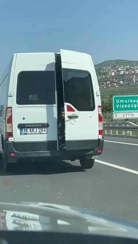 Bursa’da otobanda seyir halinde olan 16 AKJ 264 plakalı servis aracının arkasında serinlemek isteyen bir vatandaş, çareyi minibüsün arka kısmına gitmekte buldu. Aracın arka kısmına ilerleyen ve bagaj kapağını açarak ayaklarını uzatan kişi kilometrelerce o şekilde seyahat etti. Yürekleri ağza getiren görüntü, başka bir araç sürücüsünün amatör kamerasına yansıdı.(İHA)