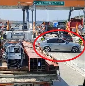 Bursa Kuzey Gişelerinde yanlış gişeye giren otomobil tırların arasından geçerek trafiği tehlikeye düşürdü. Gişe görevlisi kaza olmasını önlemek amacıyla trafiği durdurdu. Yaşanan anlar ise vatandaşın cep telefonu kamerasına yansıdı.