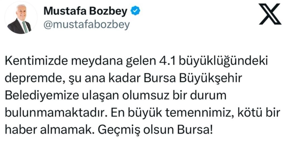 Merkez üssü Nilüfer ilçesinde meydana gelen 4.0 büyüklüğündeki deprem nedeniyle panik dolu anlar vatandaşlar sokağa dökülürken, Bursa Büyükşehir Belediye Başkanı Mustafa Bozbey, olumsuz bir durumunun yaşanmadığını sosyal medya hesabından duyurdu. Bozbey, yaptığı açıklamada, “Kentimizde meydana gelen 4.0 büyüklüğündeki depremde, şu ana kadar Bursa Büyükşehir Beledimize ulaşan olumsuz bir durum bulunmamaktadır. En büyük temennimiz, kötü bir haber almamak. Geçmiş olsun Bursa” ifadelerini kullandı.