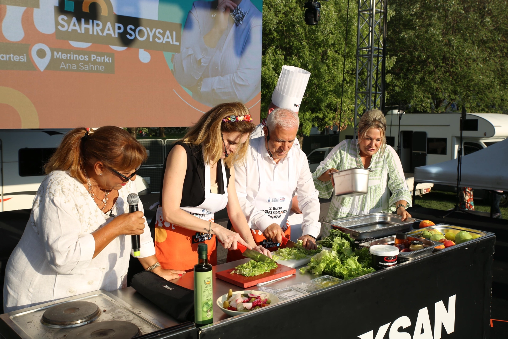 Alanda kurulan ana sahnede Sahrap Soysal ve Melek Baykal’ın sunduğu ‘Gastro Sahne’ye konuk olan Başkan Mustafa Bozbey ve eşi Seden Bozbey, mutfak önlüğünü takıp Bursa’nın coğrafi tescilli ürünlerini kullanarak ‘Bursa Dudugiller Salatası’ hazırladı. Şef Ali Müfit Çağlayan’ın yönlendirmesiyle ürünleri işleyen Başkan Mustafa Bozbey, Bursa’nın sahip olduğu tatların tümünü önce Bursalıların, sonra tüm Türkiye’nin bileceğini söyledi. Sahrap Soysal ve Melek Baykal’ın yüksek enerjisiyle keyifli anlar yaşayan katılımcılar, Başkan Bozbey’in mutfaktaki hünerlerini de izledi. Hazırlanan salatanın tadına bakan Başkan Bozbey ve eşi Seden Bozbey, meyve sebzelerle yapılan salatayı Bursalılara da tavsiye etti. Program sonunda Başkan Bozbey ve konuklar, sahnede ‘Ayva çiçek açmış’ şarkısı eşliğinde oynadı.