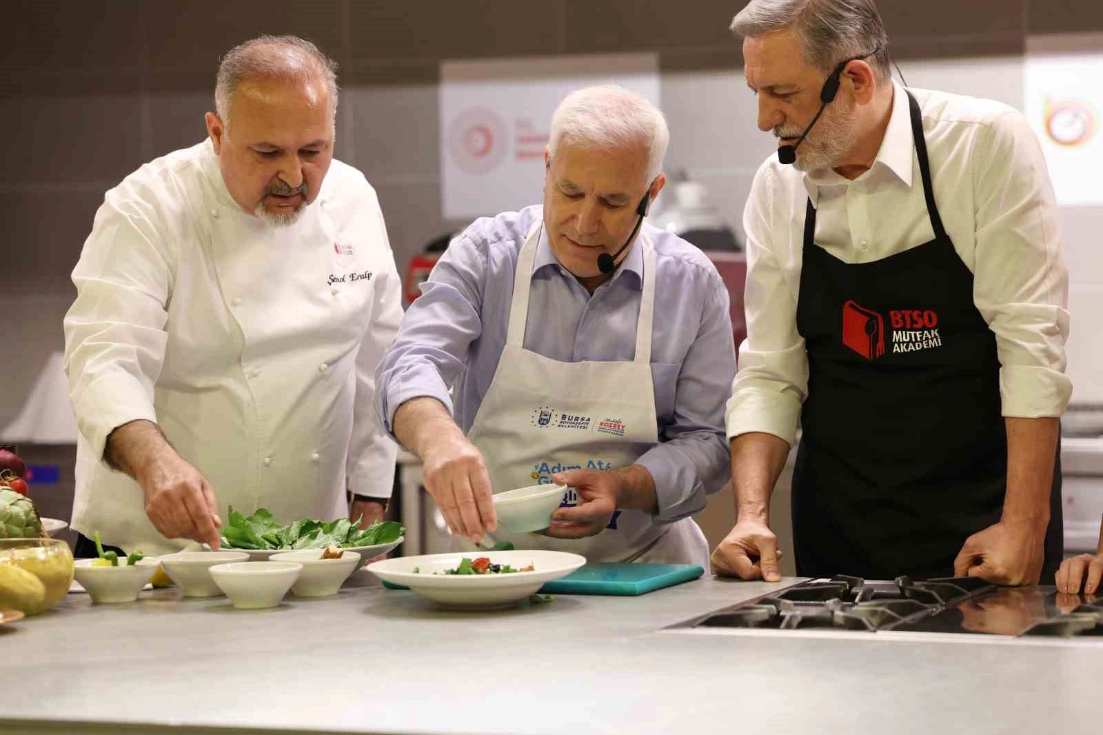 Bursa Büyükşehir Belediye Başkanı Mustafa Bozbey, ‘Adım At Gülümse, Sağlığını Önemse’ projesi çerçevesinde BTSO Mutfak Akademi’de eşi Seden Bozbey ile birlikte mutfağa girerek ’Enginarlı Fit Salata’ yaptı.