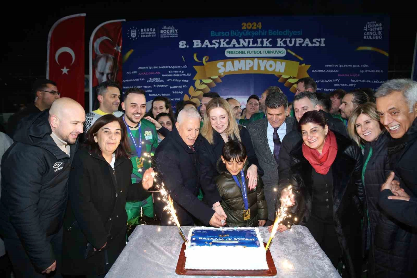 Turnuva sonunda düzenlenen kupa törenine, Bursa Büyükşehir Belediye Başkanı Mustafa Bozbey ve eşi Seden Bozbey, Genel Sekreter Doç. Dr. Ergül Halisçelik, genel sekreter yardımcıları, daire başkanları, kurum amirleri ve personel katıldı. Bursa Büyükşehir Belediye Başkanı Mustafa Bozbey, turnuva katılan 70 takımı ve yaklaşık 1000 personeli mücadelelerinden dolayı tebrik etti. Büyükşehir Belediyesi’nin şirketler dahil yaklaşık 14 bin personeli bulunduğunu söyleyen Başkan Bozbey, önümüzdeki yıllarda turnuvaya daha fazla katılımın olacağına inandığını belirtti. Büyükşehir Belediyesi olarak sosyal faaliyetleri önemsediklerini ifade eden Başkan Bozbey, “Personelimizin iyi gününde kötü gününde yanlarında olmayı, onlarla bir arada bulunmayı önemsiyoruz. Bursalıları gülümseteceksek hep beraber gülümseteceğiz. Bursalılara nitelikli ve kaliteli hizmet vermenin onurunu hep beraber yaşayacağız. Türkiye’de bu konuda ‘en iyi hizmet veren Bursa Büyükşehir Belediyesi personeli’ diye yansıtacağız. Turnuvaya katılan ve şampiyon olan takımları yürekten kutluyorum” dedi.