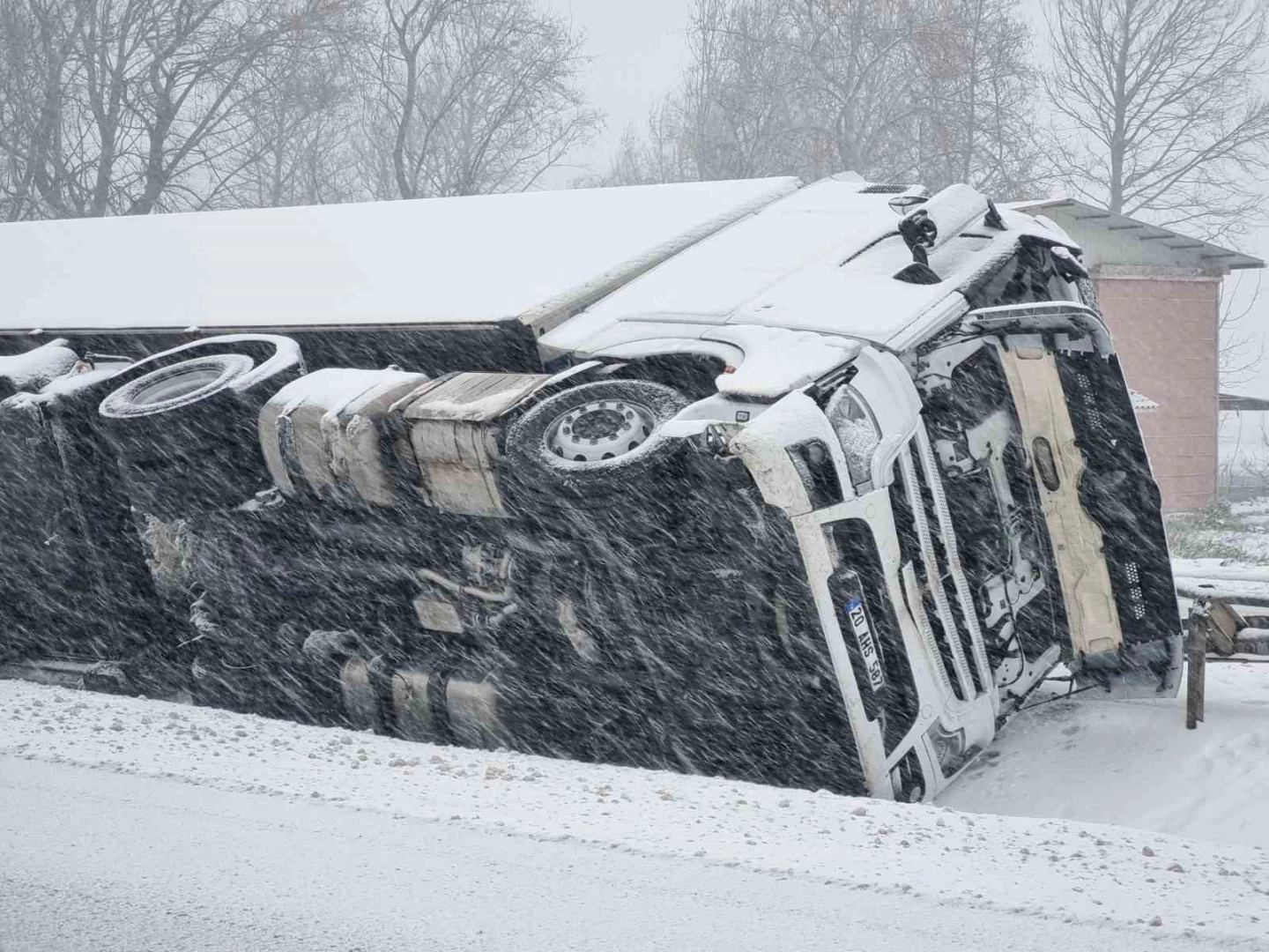 Karacabey ilçesi Uluabat mevkiinde de yoğun kar yağışı sebebiyle Bursa - İzmir Yolunun bir bölümü karla kaplanınca Bursa istikametinden Karacabey istikametine seyreden 20 AHS 587 plakalı tır karda kayıp orta refüje düştü. Yan yatan tırın sürücüsü kazadan yara almadan kurtuldu. Olayla ilgili jandarma ekipleri tahkikat başlattı.
