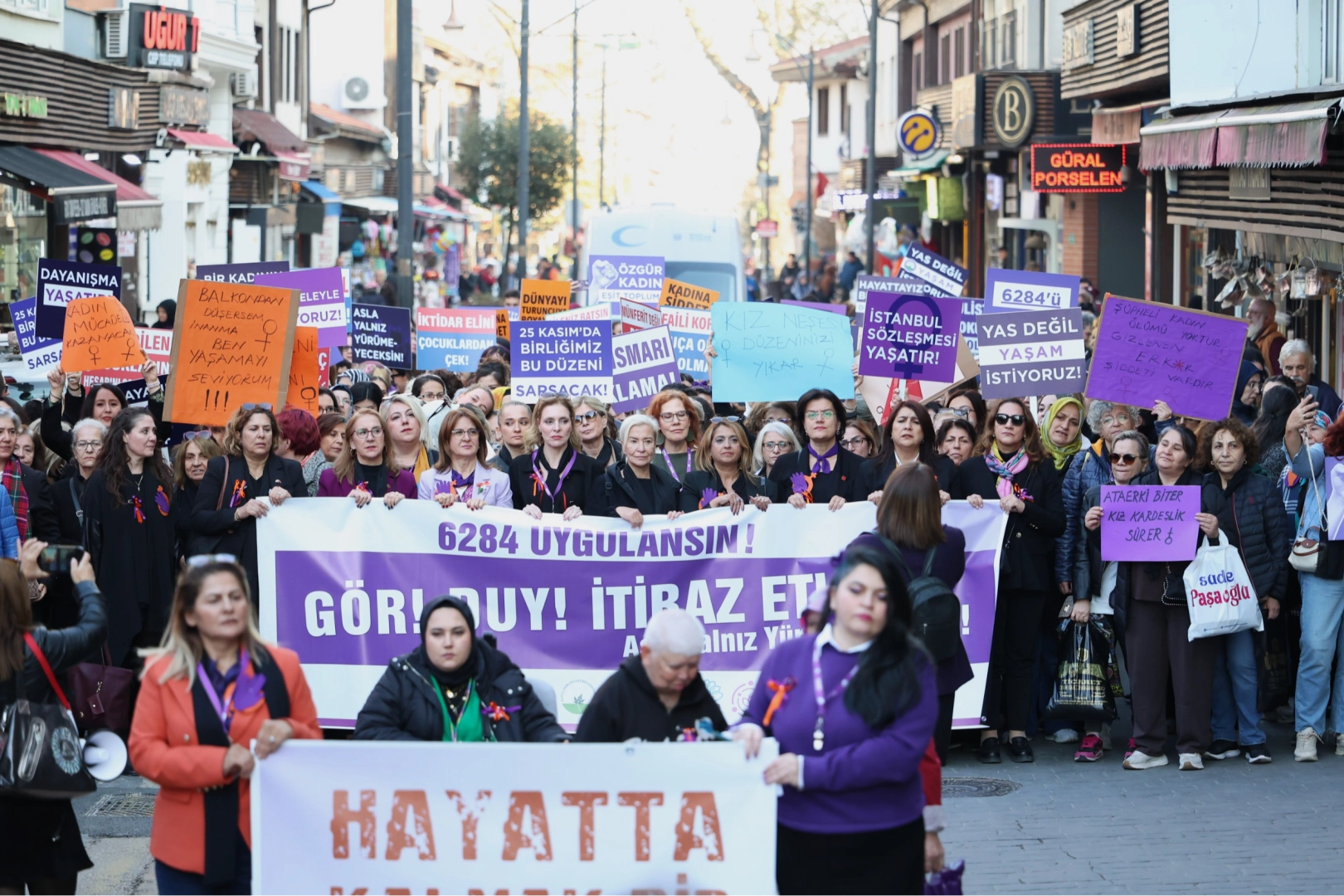 Türkiye’nin pek çok ilde olduğu gibi Bursa’da da binlerce kadın sokaklara çıktı. Cumhuriyet Caddesi’nde toplanan çok sayıda kadın ellerinde pankart ve dövizlerle şiddete, güvencesizliğe, yoksulluğa karşı hep bir ağızdan seslerini yükseltti. Güvenli ve insanca bir yaşam istediklerini belirten kadınlar yürüyüşlerini Hanlar Bölgesi’ndeki Ulu Çarşı girişinde sonlandırarak istek ve taleplerini burada yaptıkları basın açıklamasıyla dile getirdi. Osmangazi, Bursa Büyükşehir ve Nilüfer Kent Konseyi Kadın Meclisleri ile Osmangazi Belediyesi, Bursa Büyükşehir Belediyesi ve Nilüfer Belediyesi’nin ortaklaşa düzenlediği yürüyüşte binlerce kadın bir kişi daha eksilmeyecek, erkek şiddetine boyun eğmeyeceğiz diye haykırdı.