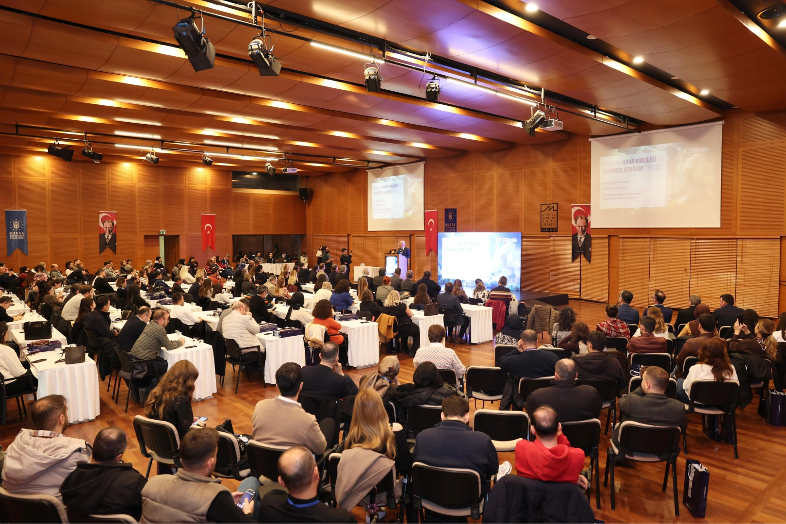 Bursa Büyükşehir Belediyesi Çevre Koruma ve Kontrol Dairesi Başkanlığı tarafından hava kalitesinin iyileştirilmesine yönelik çalışmaları artırmak, kurumlar arası iş birliğini güçlendirmek ve mevcut durumun bilimsel veriler ışığında değerlendirilmesini sağlamak amacıyla ‘Hava Kirliliği ve Çevresel Etkileri Paneli’ düzenlendi. Atatürk Kültür Merkezi Merinos Yerleşkesi’ndeki programa, Bursa Büyükşehir Belediye Başkanı Mustafa Bozbey’in yanı sıra aynı zamanda Halk Sağlığı Uzmanı olan CHP Bursa Milletvekili Prof. Dr. Kayıhan Pala, Bursa Kent Konseyi Başkanı Prof. Dr. Ertuğrul Aksoy, Büyükşehir Belediyesi yöneticileri, siyasi parti temsilcileri, meclis üyeleri, akademisyenler, kamu kurumları, meslek odaları ve sivil toplum kuruluşlarının temsilcileri katıldı.