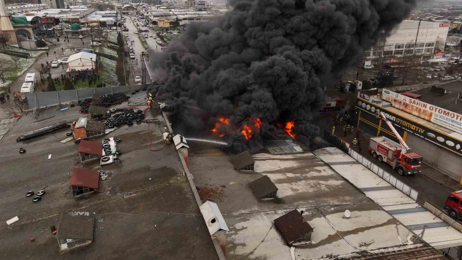 500 metrekarelik alanda 3 iş yerinin küle döndüğü yangında soğutma çalışmaları halen devam ediyor.