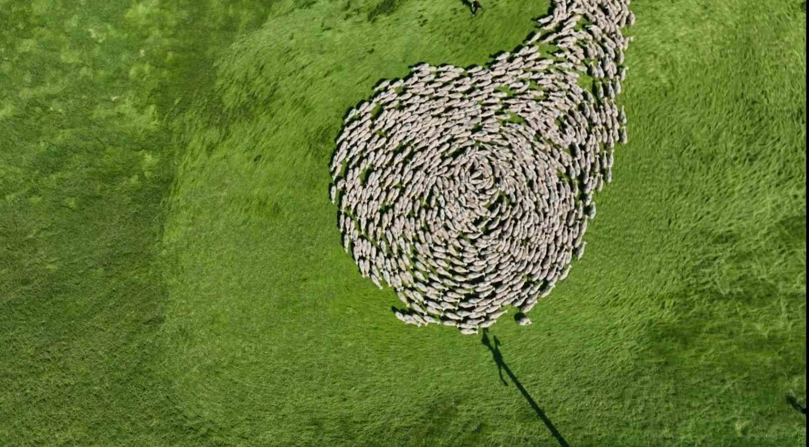 89 bin dekarlık geniş arazide faaliyet gösteren işletmede, binlerce koyunun çobanların yönlendirmesiyle aynı eksende dönerek oluşturduğu "Dünya Dönüyor" koreografisi, drone ile havadan görüntülendi. Koyunların uyum içinde hareketi, doğanın kendine özgü ahengiyle buluştu.
