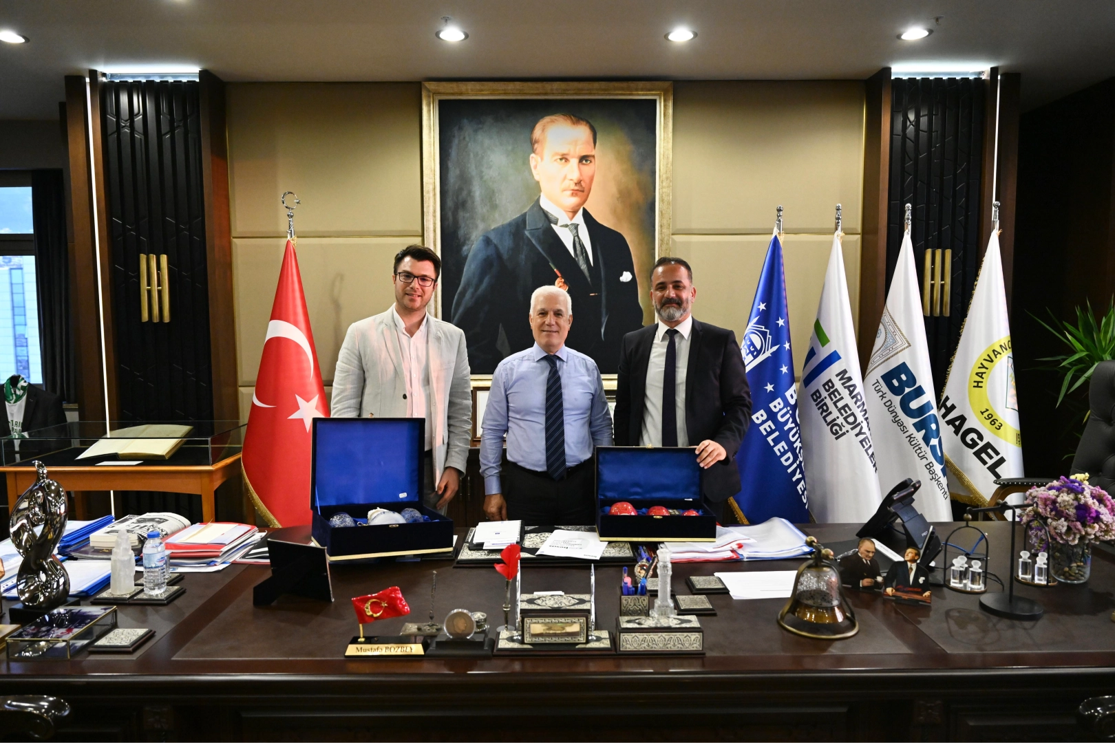 Bursa'nın kültürel mirasını ve sanat yaşamını zenginleştirmek amacıyla faaliyet gösteren Bursa Büyükşehir Belediyesi iştiraklerinden Bursa Kültür AŞ’de yeni dönemde yapılacak proje ve etkinliklere yönelik hazırlıklar sürüyor. Bursa Kültür AŞ Yönetim Kurulu Başkanı Yücel Akbulut ve Genel Müdür Yankı İçöz, Bursa Büyükşehir Belediye Başkanı Mustafa Bozbey ile makamında bir araya geldi. Bursa Kültür AŞ’nin yeni dönemde önemli işlere imza atacağını söyleyen Başkan Mustafa Bozbey, “Bursa’nın kültürel zenginliğini daha da artıracak ve halkımızın sosyal yaşamına önemli katkılar sağlayacağız. Bursa Kültür AŞ'nin ürettiği projeleri ve çalışmalarını memnuniyetle destekliyorum. Hep birlikte şehrimizi daha da güzelleştireceğiz” dedi. Bursa Kültür AŞ Yönetim Kurulu Başkanı Avukat Yücel Akbulut ise Bursa'nın kültürel dokusunu yapacakları çalışmalarla güçlendireceklerini belirterek, “Başkanımız Mustafa Bozbey'in desteğiyle, şehrimize yakışır projelere imza atacağız” diye konuştu. Şirketin yeni dönem işleyişi ve projeleri hakkında Başkan Bozbey’e bilgi veren Bursa Kültür AŞ Genel Müdürü Yankı İçöz ise, “Kültür ve sanatın her dalında öncü olacağız. Şehrimizin kültürel değerlerini koruyarak, genç nesillere ilham verecek bir kültürel dönüşüm için kolları sıvadık. Var gücümüzle çalışıyoruz. Sosyal eğitim faaliyetlerine önem veriyoruz. Bale ve dans kurslarını da yakın zamanda başlatacağız. Kentin turizm pastasından daha fazla pay alabilmesi için nitelikli projeler geliştiriyoruz. Bursa’yı uluslararası arenada tanıtacak çok özel çalışmalarımız olacak” dedi.