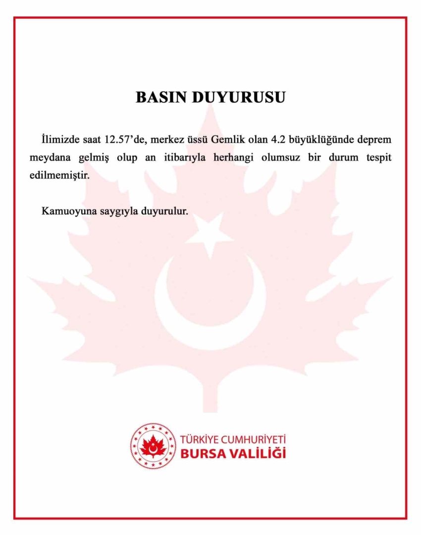 Bursa Valiliğinden konuya ilişkin yapılan açıklamada, "İlimizde saat 12.57’de merkez üssü Gemlik olan 4.2 büyüklüğünde deprem meydana gelmiş olup an itibarıyla herhangi olumsuz bir durum tespit edilmemiştir" ifadeleri yer aldı.