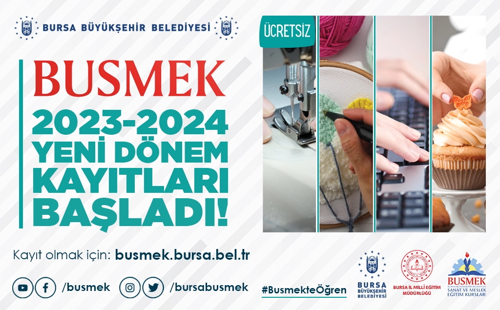 Bursa’da 17 yıldır, yüzbinlerce kişiyi ücretsiz sanat ve meslek eğitimleriyle buluşturan BUSMEK’te heyecanla beklenen yeni eğitim dönemi ön kayıtları başladı. BUSMEK, 2023-2024 eğitim döneminde 541 farklı branşla nitelikli eğitimlerine hız kesmeden devam ediyor. Kurslara ''busmek.bursa.bel.tr'' sitesinden online ön kayıt yapılabileceği gibi aynı zamanda BUSMEK kurs merkezlerinden de kayıt yaptırılabilecek ve dersler 1 Ekim’de başlayacak.