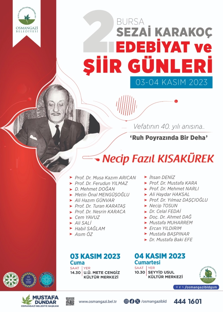 Bursa’da 3-4 Kasım tarihlerinde ‘2. Bursa Sezai Karakoç Edebiyat ve Şiir Günleri’ kapsamında “Ruh poyrazında bir deha Necip Fazıl Kısakürek” temalı sempozyum gerçekleştirilecek. Yaşantısı, kişiliği, görüşleri ve eserleriyle Türk Edebiyat ve fikir dünyasına damga vuran Necip Fazıl Kısakürek, vefatının 40’ıncı yılında düzenlenecek sempozyumla 3 Kasım tarihinde saat 14.30’da Uludağ Üniversitesi Mete Cengiz Kültür Merkezi’nde ve 4 Kasım tarihinde Seyyid Usûl Kültür Merkezi’nde devam edecek sempozyumla anılacak. Seyyid Usûl Kültür Merkezi’nde düzenlenecek sempozyumun ardından Bursa Şairleri Şiir Kütüphanesi’nin açılışı Osmangazi Belediye Başkanı Mustafa Dündar tarafından yapılacak.