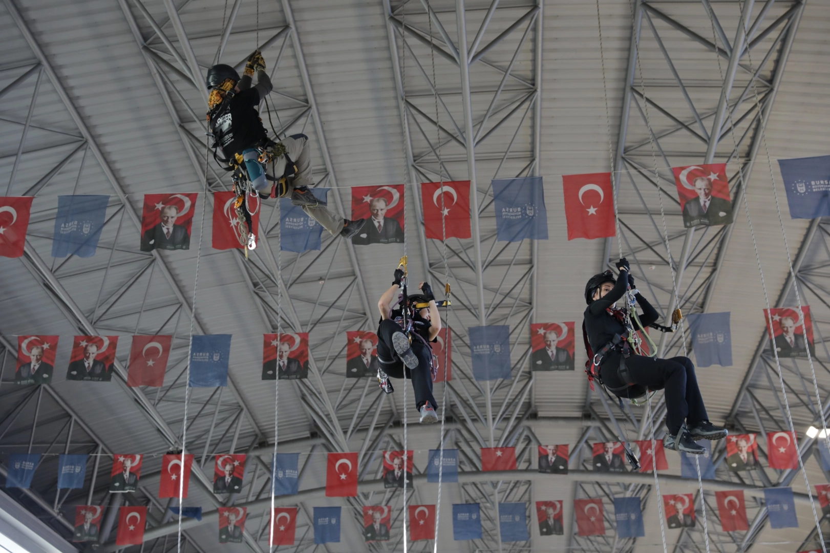 Bursa Büyükşehir Belediyesi, afetlere dirençli kent vizyonu doğrultusunda, BAM başta olmak üzere tüm ilgili birimlerin eğitim ve hazırlık faaliyetlerini aralıksız sürdürmeye devam ediyor. Merinos Yerleşkesi Fuaye Alanı’nda ‘İple Kurtarma Sistemleri ve Arama-Kurtarma eğitimi’ alan ekipler, uzman eğitmenler eşliğinde tavana asılı halatlara güvenlik ekipmanlarını kullanarak tırmandı. Yüksekten erişim, dar alanlara giriş, dikey kurtarma ve zorlu koşullarda güvenli müdahale kabiliyetlerinin geliştirilmesinin amaçlandığı eğitimde, teorik ve pratik bilgiler verildi. Eğitimde, personelin kişisel güvenliği, ekipman kullanımı, düğüm teknikleri, ip sistemleri ve koordineli kurtarma senaryoları uygulandı.