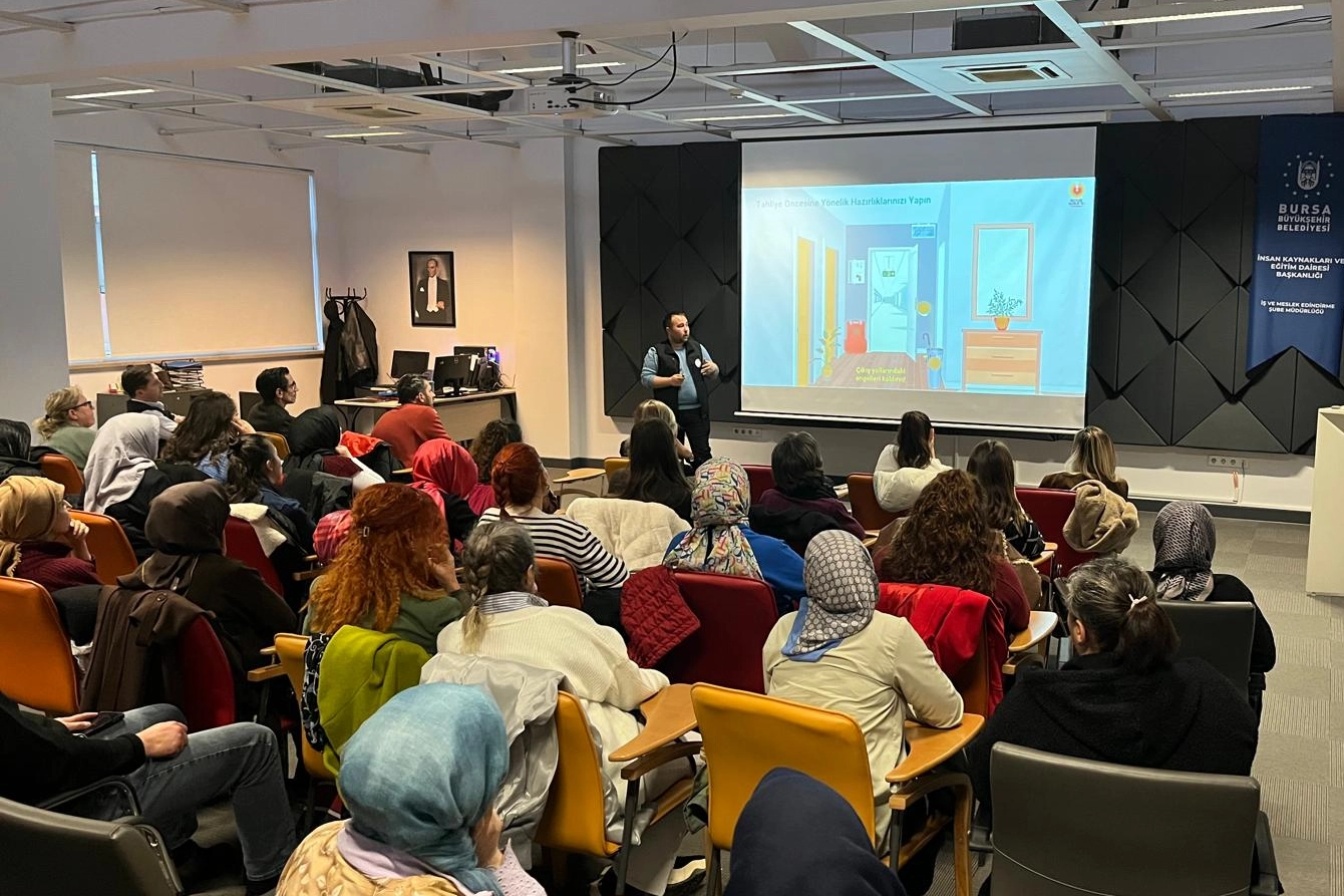 Bursa’yı daha dirençli, daha güvenli ve yaşanabilir bir kent haline getirmek amacıyla katılımcı bir anlayışla çalışmalarını sürdüren Bursa Büyükşehir Belediyesi, çalışanlarına yönelik farkındalık eğitimlerine devam ediyor. Bu kapsamda Afet İşleri ve Risk Yönetimi Dairesi Başkanlığı tarafından, İş ve Meslek Edindirme Şube Müdürlüğü personeline yönelik “Afet Farkındalık Eğitimi” düzenlendi. Eğitim programında, başta deprem olmak üzere sel ve su baskını gibi doğal afetlerde doğru hareket tarzları ele alındı. Ayrıca afet öncesi, afet sırası ve sonrasında doğru davranış biçimleri, uzmanlar tarafından kapsamlı şekilde aktarıldı.