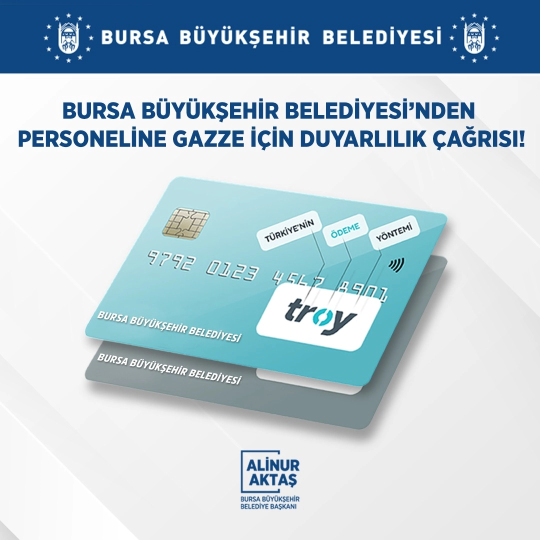 Bursa Büyükşehir Belediyesi’nin “Maaş Protokol Sözleşmesi” yaptığı Yapı ve Kredi Bankası maaş kartı ve kredi kartları, Visa / MasterCard ödeme altyapısını kullanırken, Büyükşehir’den TROY kart hamlesi geldi. Gazze'de masum insanları katleden İsrail ile İsrail'in savaş suçlarına açıkça desteğini ilan eden şirketlerin ürün ve mallarının boykot edilmesine yönelik toplumsal duyarlılığa destek veren Büyükşehir Belediyesi, BUSKİ ve iştirakler de dahil tüm personelin yerli ve milli ödeme yönetimi TROY’a geçişi için düğmeye bastı. Troy Kart’a geçiş için Yapı ve Kredi Bankası ile görüşme yapılırken, banka ile personel arasında ürün sözleşmelerinin bireysel olarak yapıldığı, bu nedenle de geçiş işleminin ancak bireysel başvuruyla yapılabileceği belirtildi.