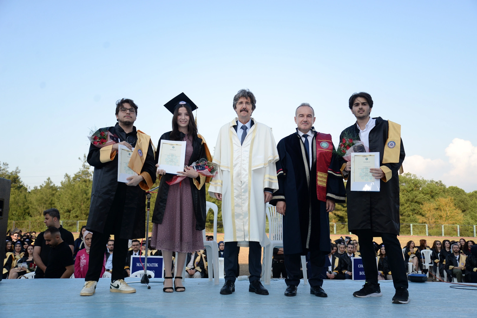 Fakülte birincisi, ikincisi ve üçüncüsünün ödüllendirildiği mezuniyet töreni, anı belgelerinin dağıtılması ve hep birlikte kep fırlatılmasının ardından tamamlandı.