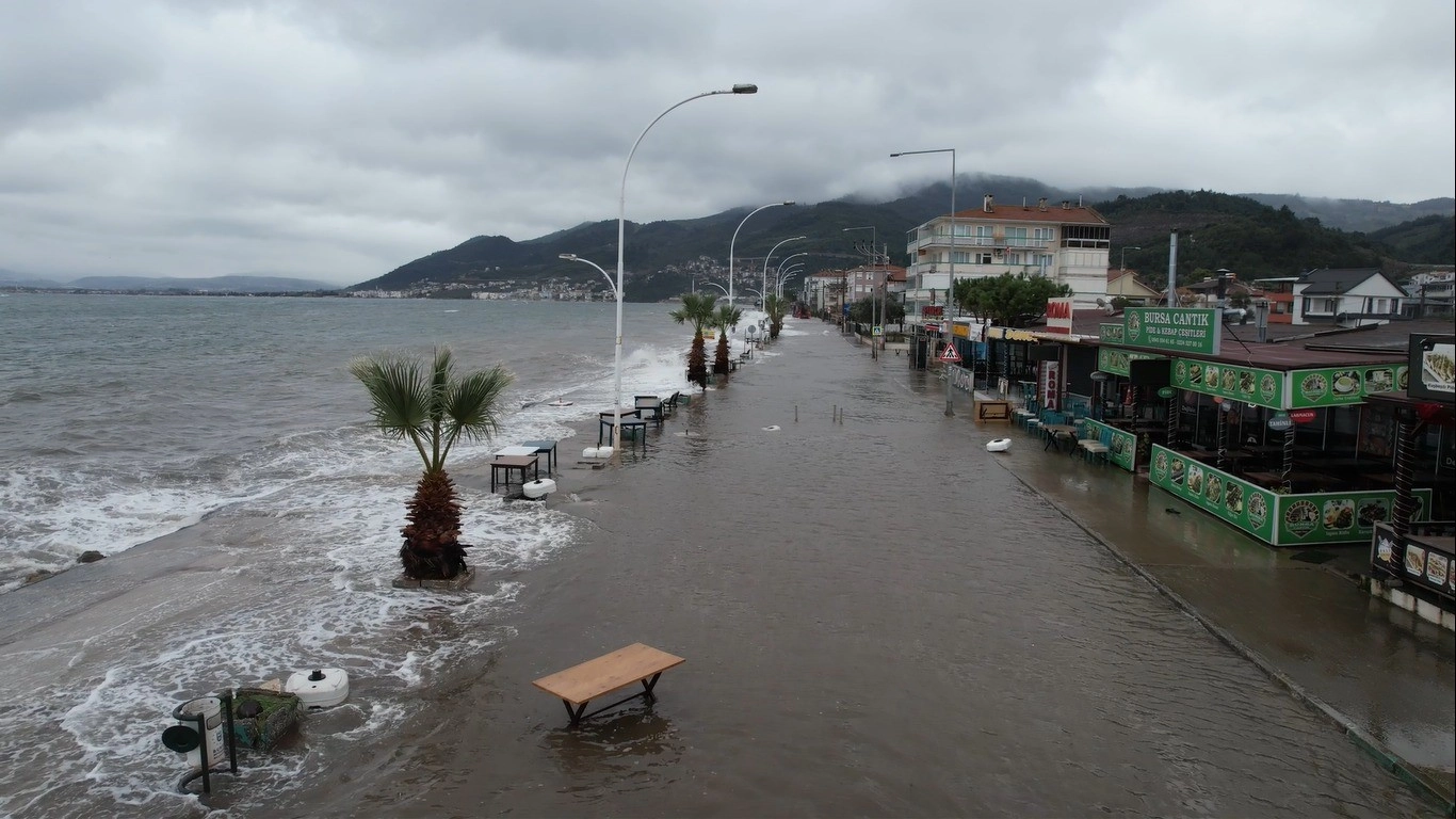 Fırtınanın etkisiyle oluşan deniz taşkını ve dalgaların yola kadar ulaştığı anlar ise dron ile havadan görüntülendi. Görüntülerde sahil yolunun büyük bölümünün suyla kaplandığı ve dalgaların kıyı hattını aştığı görüldü.