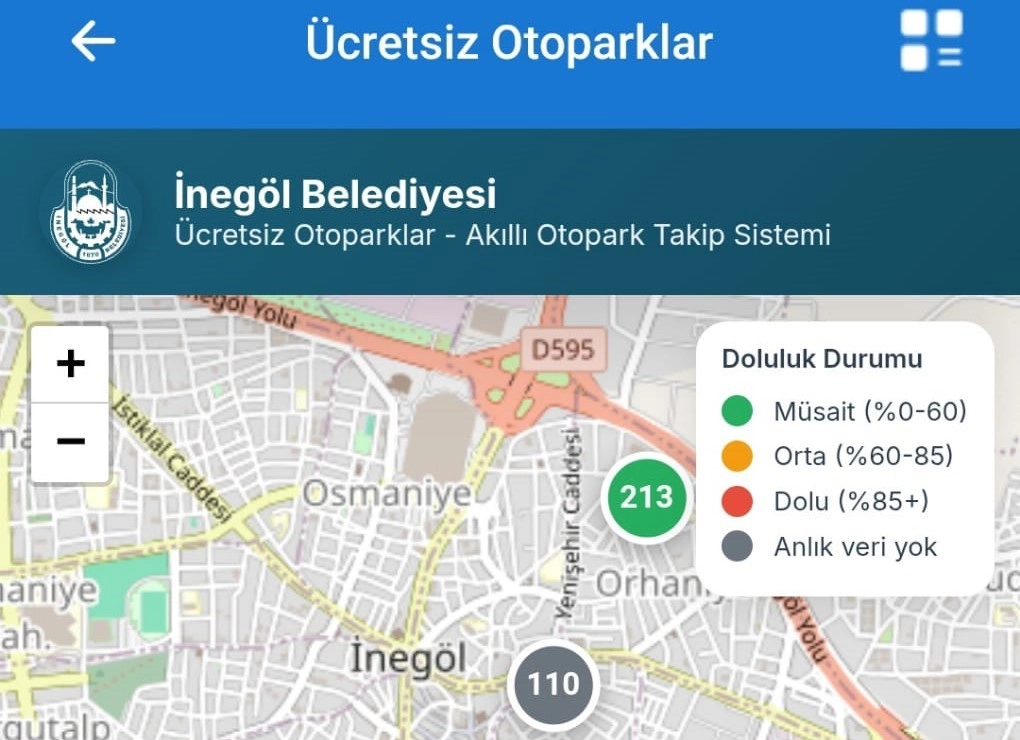İnegöl’de ücretsiz otoparkların anlık doluluk oranı artık cebinizde