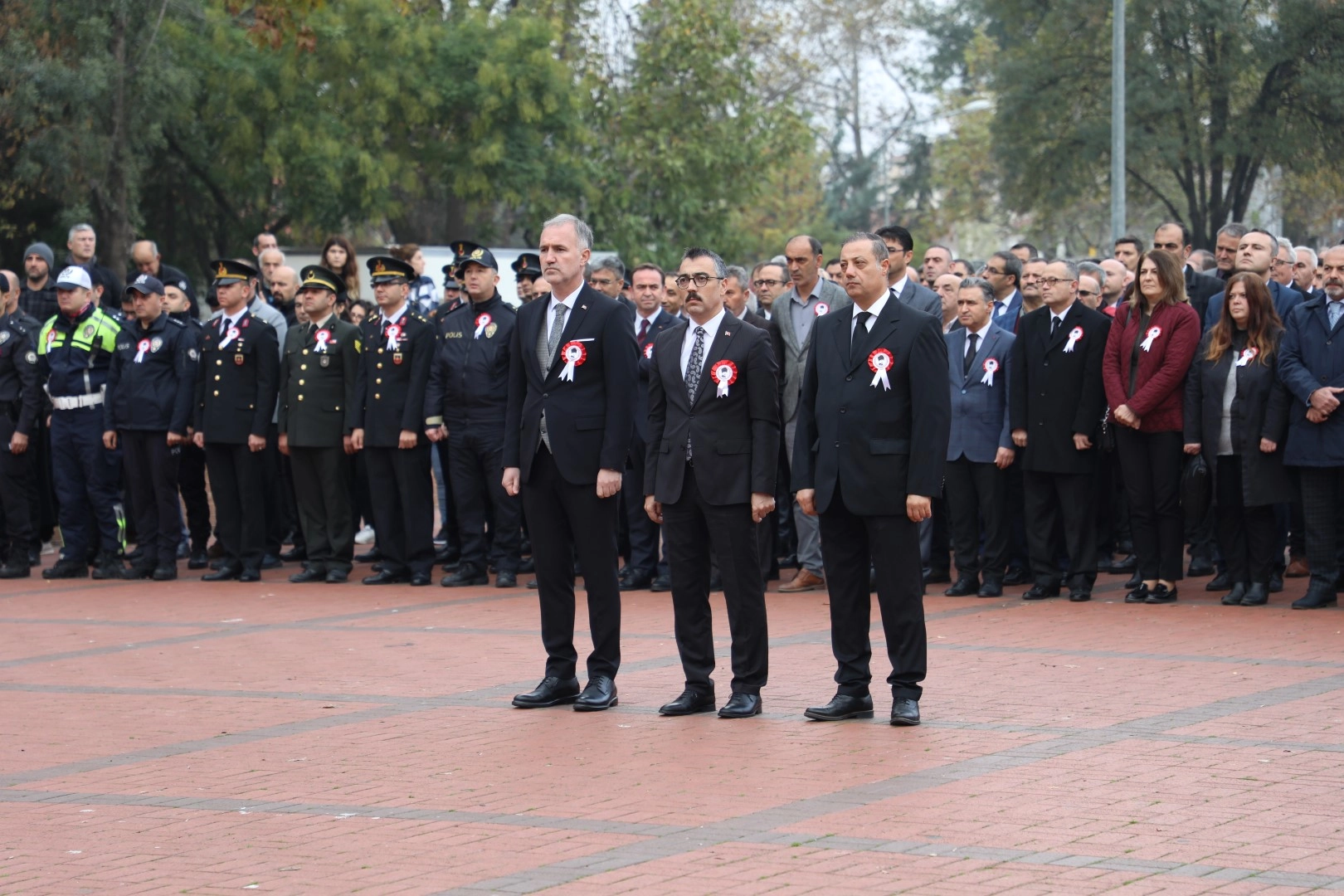 Sirenlerin çaldığı sırada çevrede hareket halinde olan araçların sürücüleri, vatandaşlar, yayalar, yaşlılar, çalışanlar saygı duruşunda bulundular. İstiklâl Marşı’nın okunması ile Anıt önündeki tören sona erdi.