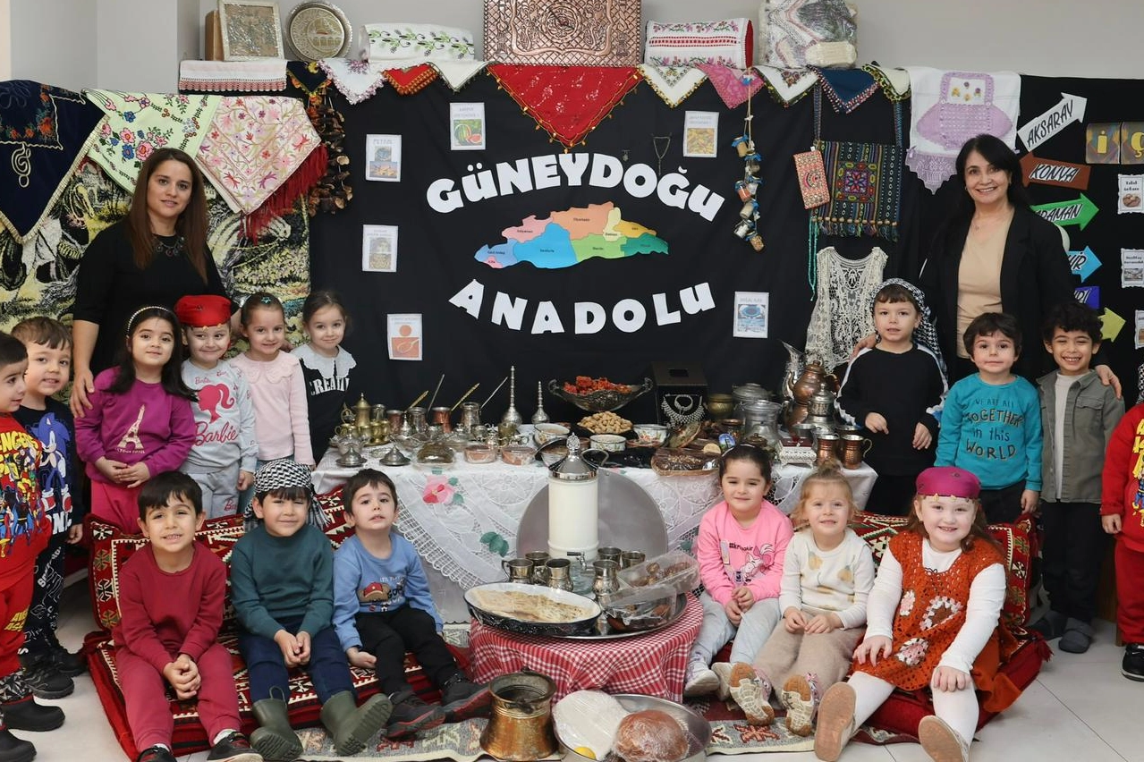 Atatürk Anaokulu’nun sevgi dolu minik öğrencileri, birbirinden güzel öğretmenlerinin öncülüğünde okulda yer alan görevlilerin yardımıyla Türkiye’nin 7 bölgesi ile Yerli ve Milli Teknoloji masalarını kurdu. Her bir sınıf masasını ait olduğu bölgenin kıyafetleri ile yiyecek ve içecekleriyle donattı. Yapılan etkinliğin ardından öğrenciler yapılan yiyecek ve içecekleri afiyetle tadına baktı.
