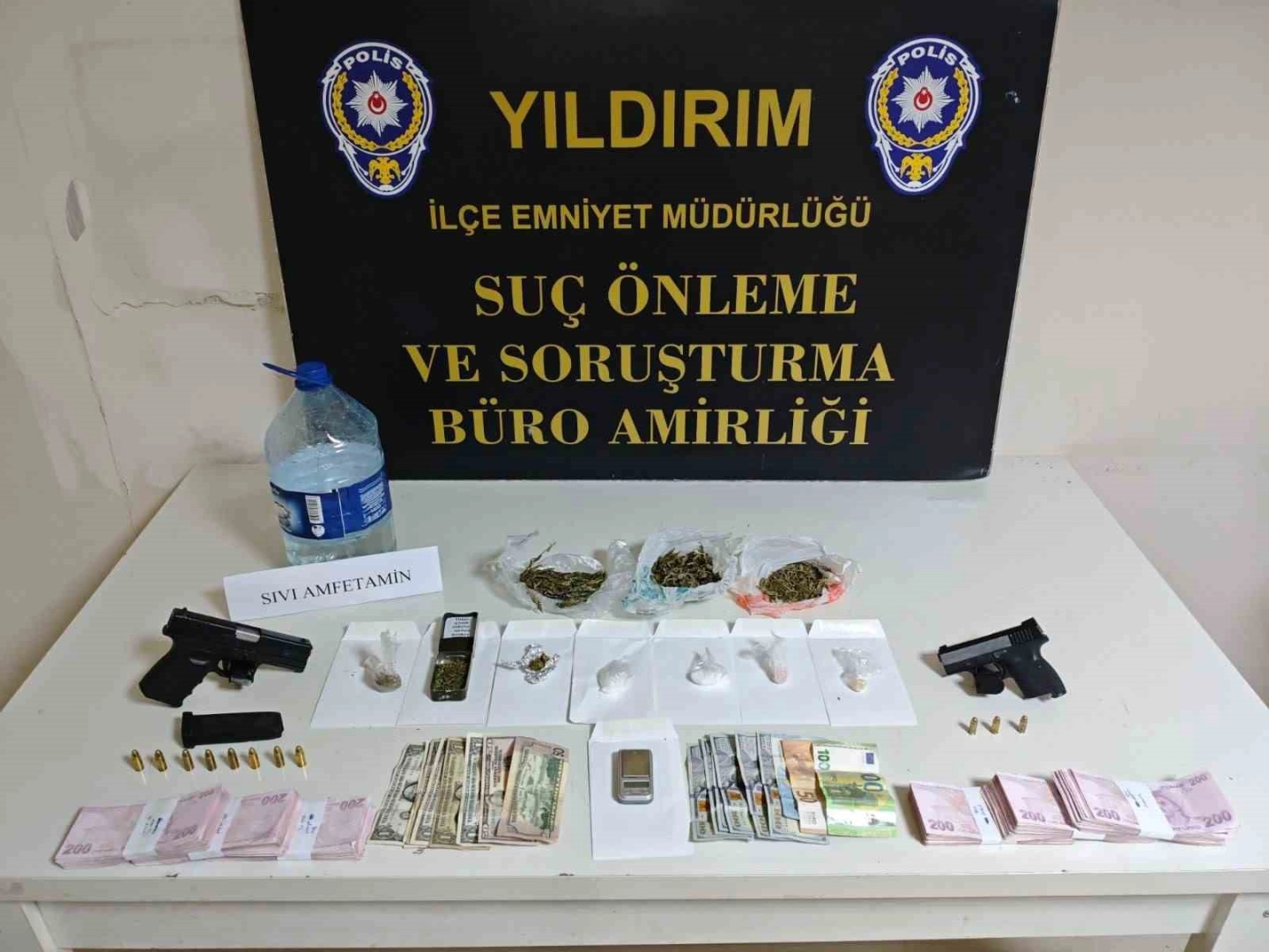 Bursa Emniyet Müdürlüğü Yıldırım İlçe Emniyet Müdürlüğü’ne bağlı Yıldırım Suç Önleme ve Soruşturma Büro Amirliği ekiplerince yapılan çalışmalarda, Yeşil Mahallesi’nde bulunan bir ikamette, hakkında farklı suçlardan 4 yıl 2 ay kesinleşmiş hapis cezası bulunan Yelid A.’nın saklandığı aynı adreste, uyuşturucu madde ticareti yapıldığı ve ruhsatsız silah bulundurulduğu bilgisine ulaşıldı.