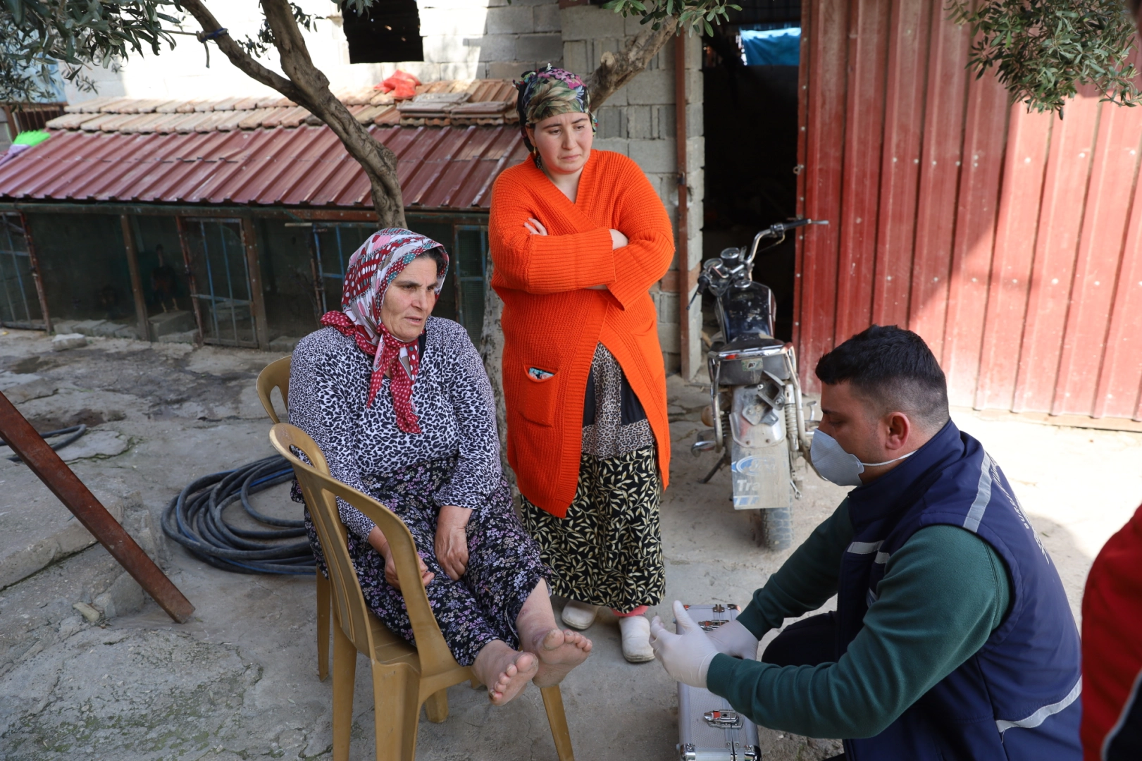 Hatay’da Türkiye genelinden gelen yardımların dağıtımı, geçici yaşam alanlarının oluşturulması ve seyyar tuvaletlerin kurulması görevlerini üstlenen Bursa Büyükşehir Belediyesi bir yandan da afetzedelerin ihtiyaçlarını gidermeye devam ediyor. Yaşanan depremlerde evi ağır hasar gören ve evden çıkarken ayağından yaralanan 59 yaşındaki kalp hastası Vahide Tekin’in yakınları, ‘Bursa Büyükşehir Belediyesi ekiplerine ulaşıp’ sağlık hizmetleri için destek istedi. Bunun üzerine Antakya’da bulunan Büyükşehir Evde Hasta Bakım Merkezi ekipleri, ilçe merkezinden 30 kilometre uzaklıktaki Avsuyu Mahallesi’ne doğru harekete geçti. Burada kız kardeşinin evinin bahçesinde kurdukları çadırda yaşayan Vahide Tekin’e ulaşan ekipler, gerekli müdahaleyi yaptı.