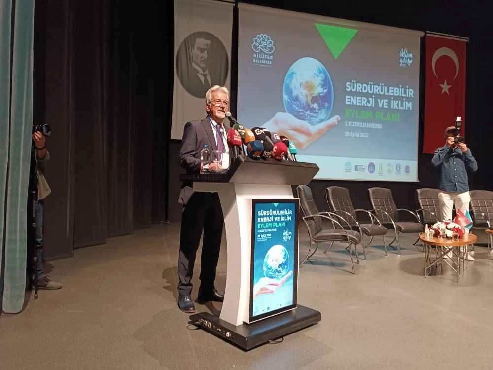 Enerji ve İklim eylem planı açılış konuşmasını Nilüfer Belediye Başkanı Turgay Erdem gerçekleştirdi. Başkan Erdem, "Küresel ısınma ekolojik dengenin bozulması ve kuraklık kendini hissettirmeye başladı.Türkiye'de göllerin kuruduğu haberlerini alıyoruz. Bu durum tarımı etkileyecek ve kuraklığı getirecek. Bu gidişi değiştirebiliriz. Krizi durduramasakta şiddetini durdurabiliriz. Nilüfer de bu yönde çaba sarf ediyoruz. Bir çok ülkede buğday stokları için çalışmalar var ama Türkiye avantajlı bir ülke potansiyelimizi harekete geçirmek için Nilüfer de çiftçilerimiz tekrar üretebilen diye çalışmalar yapıyoruz. Hibrit tohum yerine ata tohumunu yaymak için kütüphane kurduk. Tohum takas şenlikleri yaparak ata tohumlarını yurdun dört bir yanından getiriyoruz. Balkon üretimine teşvik için vatandaşa ata tohumları ücretsiz dağıtıyoruz."dedi.