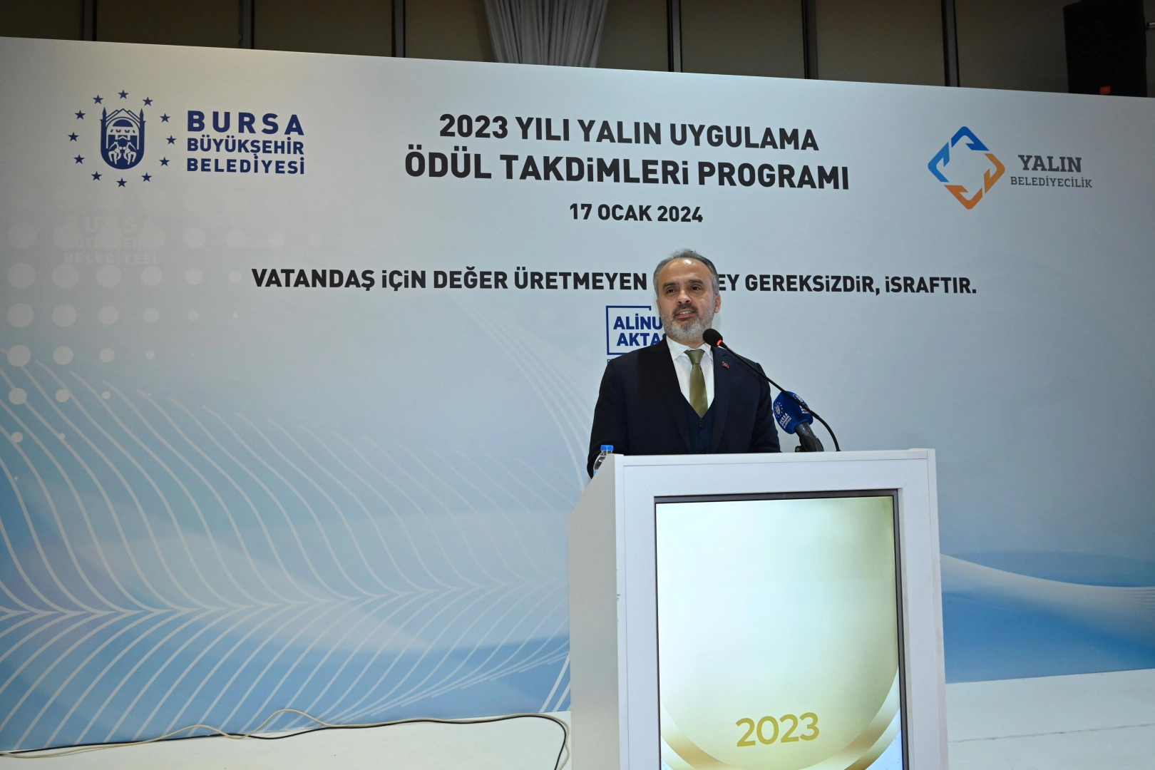 Bursa Büyükşehir Belediyesi, var olan kaynakların en etkin şekilde kullanılarak en verimli hizmetin sunulabilmesi amacıyla, kamuda örneklerine fazla rastlanılmayan yalın yönetim sistemini 2020 yılında uygulamaya başladı. Türkiye’de yerel yönetimlere örnek olarak başlatılan uygulama kapsamında yapılan çalışmalarla, vatandaş için değer üretmeyen ancak kaynak tüketen her şey gereksiz ve israf olarak tanımlandı. Atatürk Kongre ve Kültür Merkezi’nde 2023 yılındaki yalın uygulamaların ödüllendirilmesine yönelik düzenlenen törene Bursa Büyükşehir Belediye Başkanı Alinur Aktaş, Büyükşehir Belediyesi Genel Sekreteri Ulaş Akhan, Genel Sekreter Yardımcıları ile Belediye iştiraklerinin Genel Müdür ve Genel Müdür Yardımcıları, Daire Başkanları ve Yalın yönetim ekipleri katıldı. Ödül töreni öncesinde Yalın Uygulamalarla ilgili çalışma yapan ekipler arasında Yalın Uygulamalara dair kelimelerle ilgili bir oyun oynandı. Ödül takdimi öncesi Strateji Geliştirme Dairesi Başkanı Alper Bayrak, Yalın Belediyecilik ve ödüllendirme sistemi ile ilgili bilgiler içeren bir sunum gerçekleştirdi.