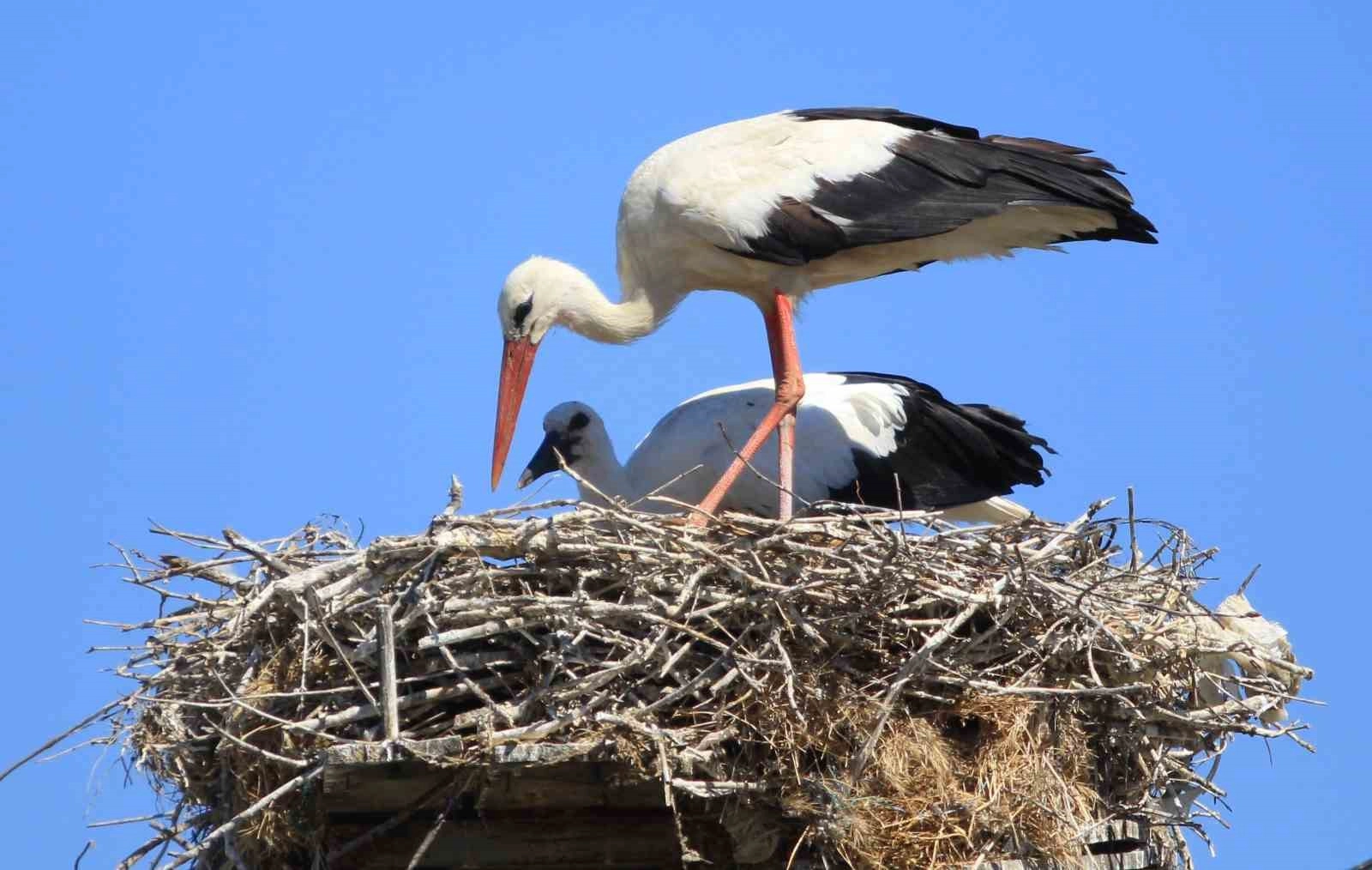 Yumurtadan çıkan yavrular ve onları besleme telaşı içinde yiyecek bulmak için kanatlanan anne ve baba leylekler, mahallede adeta bir görsel şölen oluşturuyor.