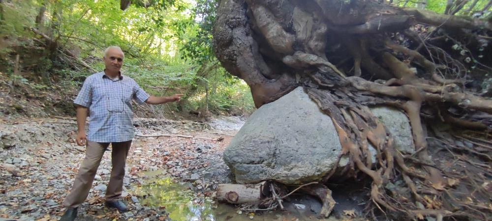 Aslında bir taşla ağacın ortak bir yaşamı ortak yaşayabildiklerinin bir kanıtı. Selle birlikte toprak kaysa bile ağacın kökleri, sarmaladığı kayayı tutmaya devam ediyor. Bu ağacın yaklaşık 200-300 yaşında olduğunu tahmin ediyoruz. Taşta bir metreye 2 metre gibi boyutlarında. Yaklaşık 1 metre de yüksekliği var. Yaklaşık 2 veya 3 ton ağırlığında vardır. Bu sel bunların ikisini ortaya çıkarmış. Her yerde rastlanamayacak ilginç bir görüntü. Fasulyelere sırık yapmaya geldiğim zaman bu ilginç görüntü ile karşılaştım. Hemen fotoğrafladım" diye konuştu.