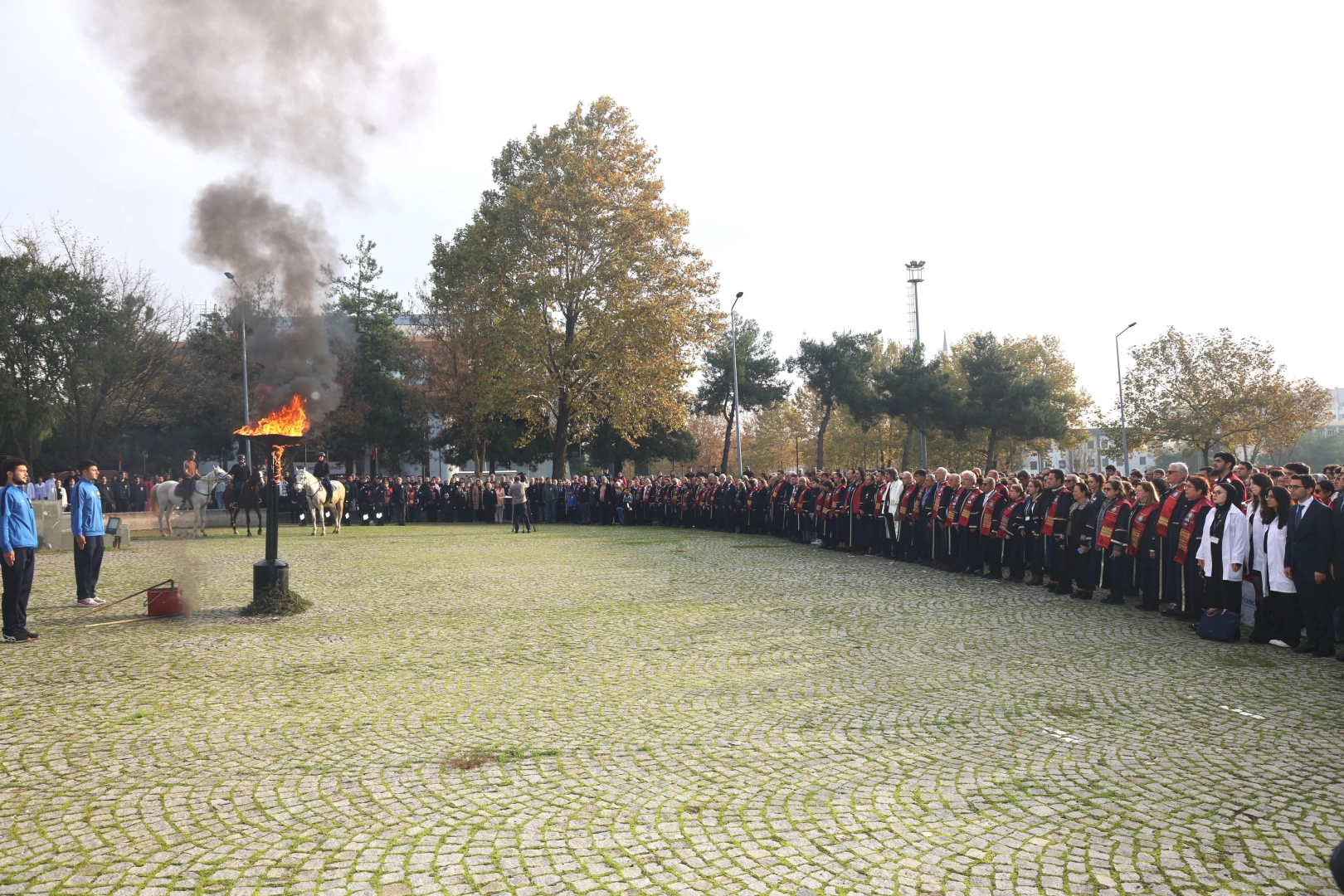 Şehit Astsubay Ömer Halisdemir Meydanı’ndaki Atatürk Anıtı önünde yapılan törene yüzlerce akademik ve idari personel ile çok sayıda öğrenci katıldı. Tören BUÜ Rektörü Prof. Dr. Ferudun Yılmaz’ın öğrencilerle birlikte anıta çelenk koymasıyla başladı. 09.05’te yankılanan siren seslerinin ardından hep birlikte İstiklal Marşı’nın okunmasıyla birlikte tören sona erdi.
