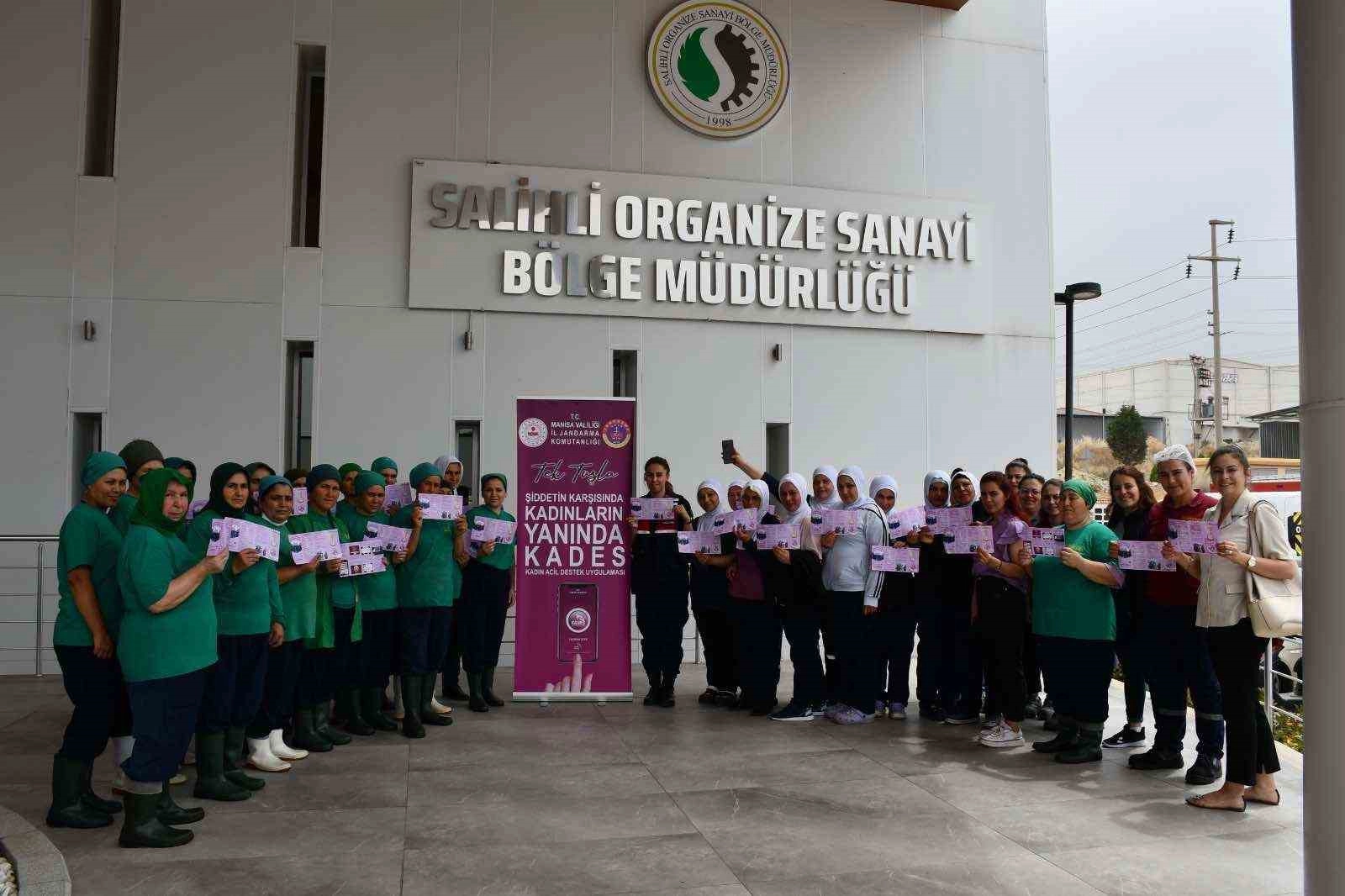 Manisa’nın Salihli ilçesinde Jandarma Komutanlığına bağlı Aile içi Şiddetle Mücadele ve Çocuk Kısım Amirliği ekipleri, işçi kadınlara Kadın Destek Uygulaması’nı (KADES) tanıtarak, kadına yönelik şiddete karşı farkındalık oluşturdu.