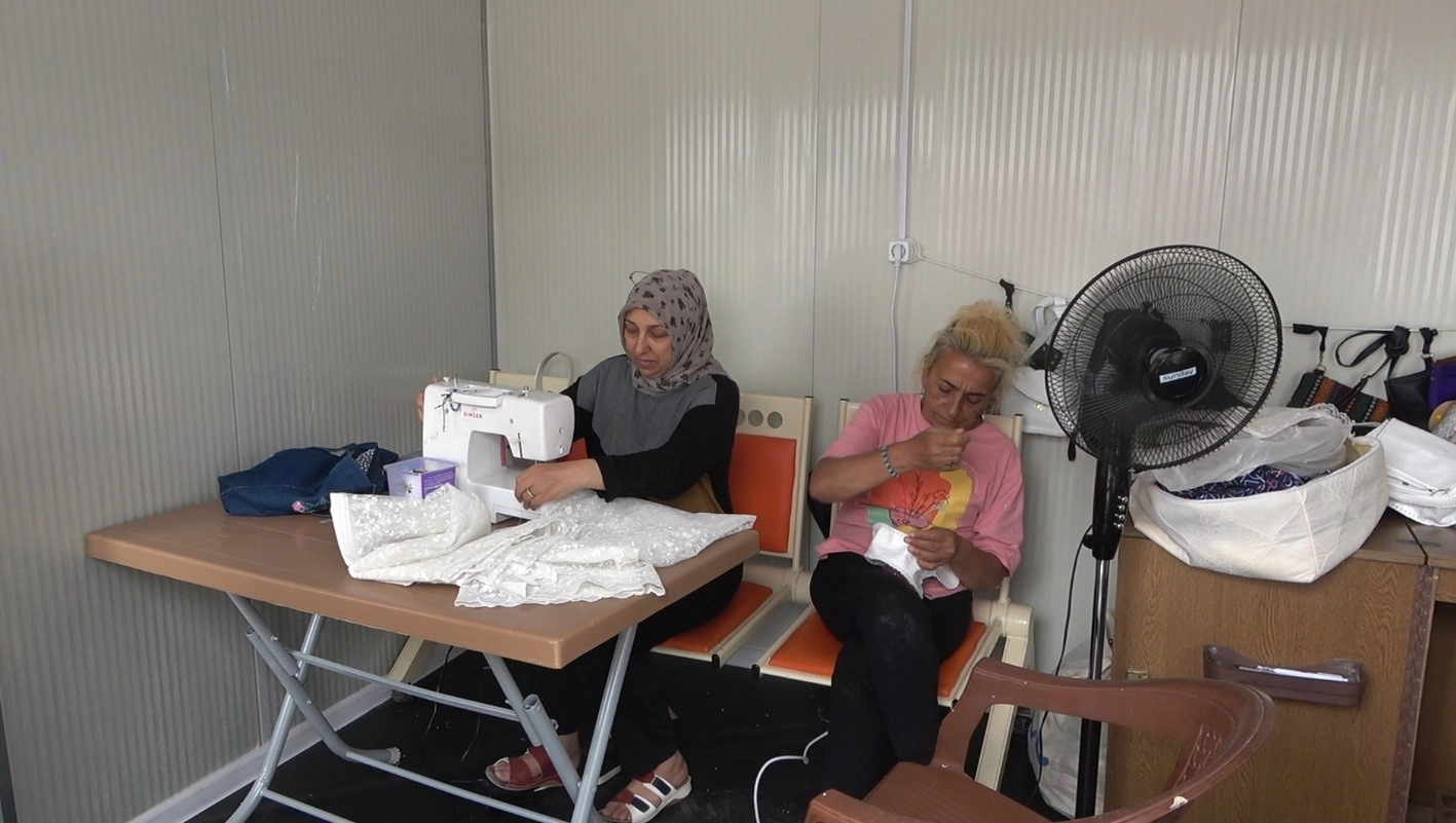 Osmaniye Karaçay Konteyner kente Halk Eğitimi Merkezi tarafından açılan dikiş nakış kursuna katılan kadınlar, usta öğreticilerden eğitim alıyor. Eğitim alan kadınlar elbise, masa örtüsü, el örgüsünden yelek, çanta, işlemeli havlu ve nevresim takımı gibi çeşitli ürünler dikiyor. Depremzedelerin yaşadıkları travmayı bir nebze atlatmaları, acılarını unutturmak için görevlendirildiklerini belirten Usta öğretici Leyla Akay,"Konteyner kentte kadınlara dikiş, nakış, örgü öğretmeye çalışıyoruz. Buradaki insanlara yardımcı olmak için çalışıyoruz. Devletimizden de Allah razı olsun bizlere bu imkanı sağladı. Halk Eğitimden buradaki görevli kaymakamımızdan valimize kadar hepsine ayrı ayrı teşekkür ediyoruz" dedi.