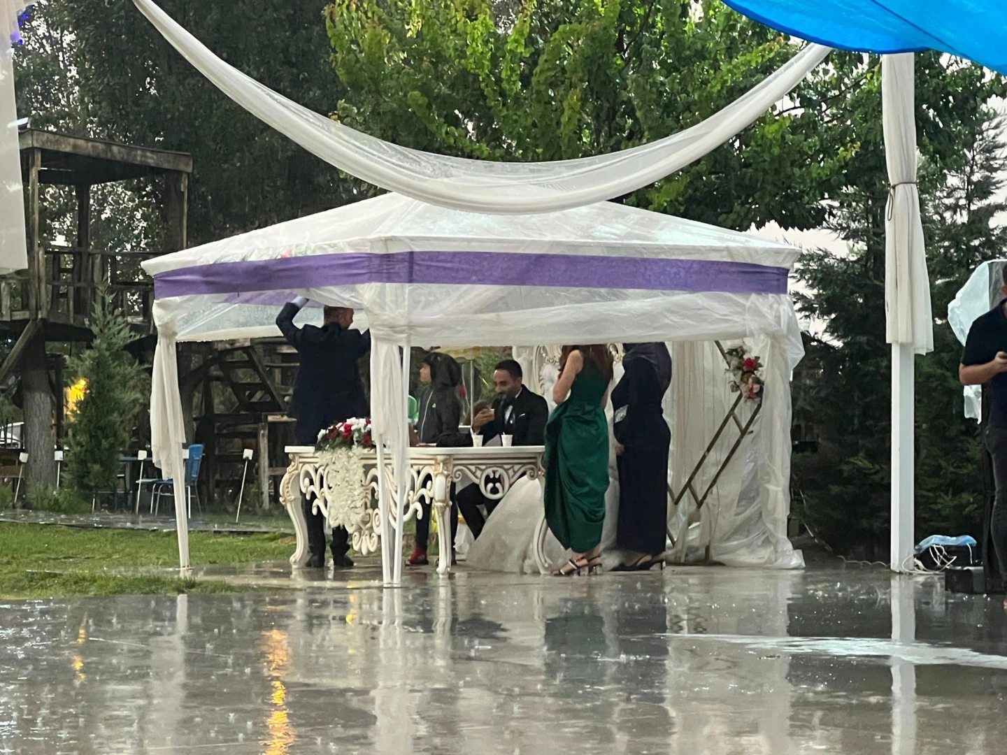 Çift; açık alanda düğün yapmak için aylar öncesinden kır bahçesi kiraladı. Düğün saatinde sahneye çıkan çift ilk danslarını yaptıktan sonra bir anda bastıran sağanaktan kurtulmak için üstü kapalı alana geçti. Yağış şiddetini gittikçe artırınca çiftin nikâhları da sağanak yağmur altında kıyıldı.