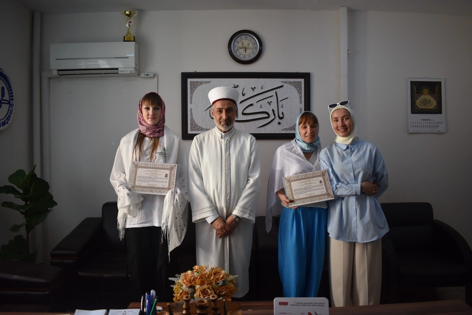 Müftü Bakır, "Yaklaşık bir buçuk yıl önce Anastasia (Safiye) kardeşimiz, araştırarak ve öğrenerek Müslüman olmaya karar vererek müftülüğümüze başvurmuş ve ihtida işlemini gerçekleştirmiştik. Safiye kardeşimizin arkadaşı olan Natalia ve kızı Yulia’ya İslam dinini anlatması ve Müslüman olmalarını tavsiye etmesi neticesinde bugün Natalia hanım ve kızı Yulia’nın kelime-i şehadet getirmeleri ve yepyeni bir hayata başlamalarına şahitlik ediyoruz. Bundan sonra sizlerin de Safiye hanım gibi örnek olarak nice insanların İslam’a girmesine vesile olmanızı Yüce Allah’tan niyaz ediyorum. Rabbim, iman ve teslimiyetinizi kabul etsin" ifadelerini kullandı.