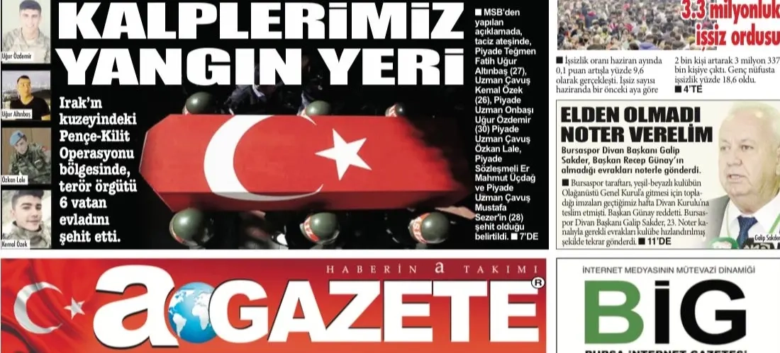 Günlük gazetelerin, ulusal ve yerel gazetelerin ilk sayfalarına son dakika gazete manşetlerine agazete.com.tr'den takip edin. İşte günlük gazete haberleri, Türkçe gazeteler ve gazete manşetleri... Akşam, Aydınlık, Birgün, Cumhuriyet, Diriliş Postası, Dünya, Evrensel, Hürriyet, Karar, Milat, Milli Gazete, Milliyet, Posta, Sabah, Sözcü, Takvim, Türkgün, Türkiye Gazetesi, Yeni Asya, Yenibirlik, Yeniçağ, Yeni Şafak gazetelerinin manşetlerini agazete.com.tr'den okuyun...