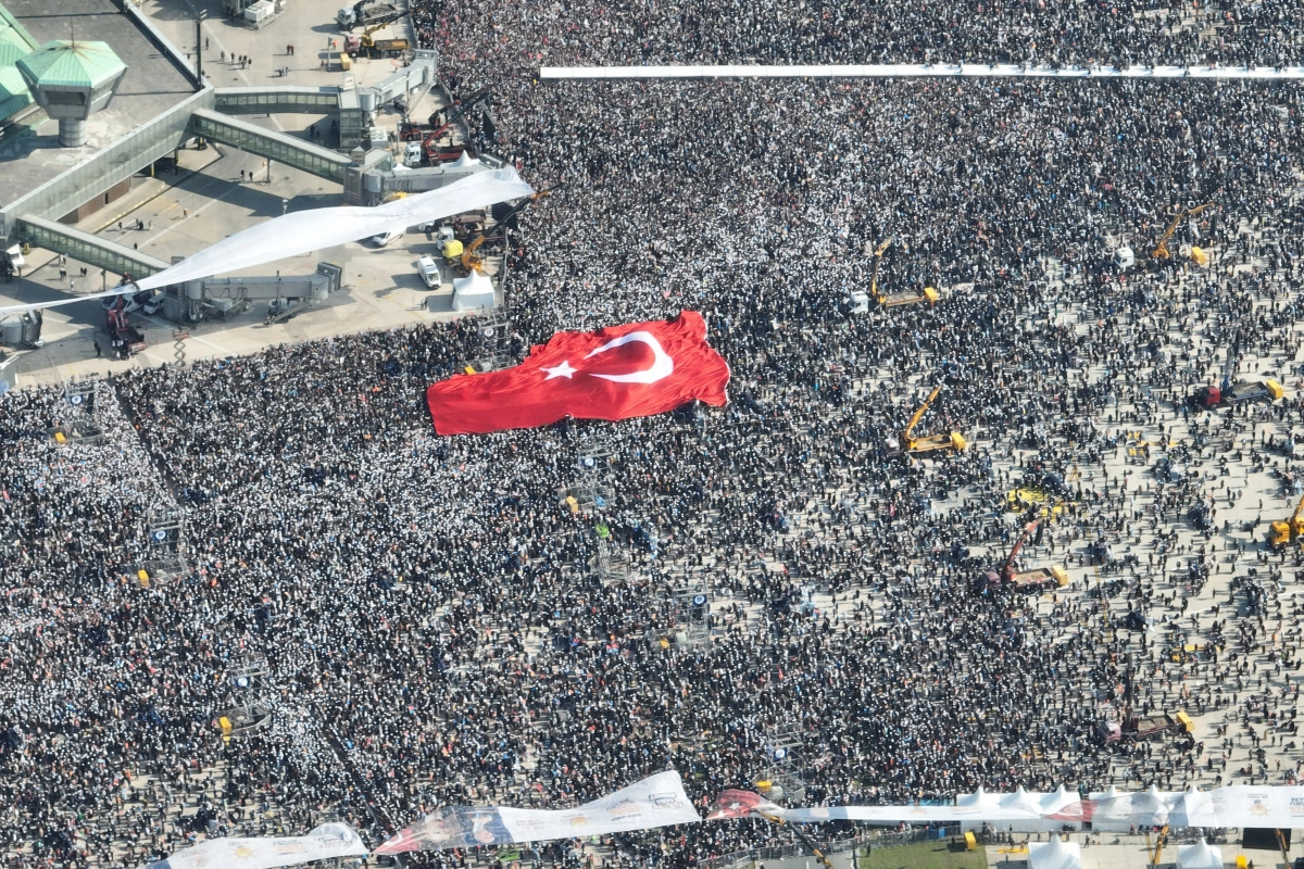 Cumhurbaşkanı Recep Tayyip Erdoğan, AK Parti İstanbul İl Başkanlığı tarafından düzenlenen “Büyük İstanbul Mitingi”nde katıldı. Erdoğan, mitinge resmi katılım rakamının 1 milyon 700 bin olduğunu söyledi. Miting alanı dron ile havadan görüntülendi. Görüntülerde, vatandaşların alanı doldurduğu ve dev Türk bayrağı açtığı görüldü.