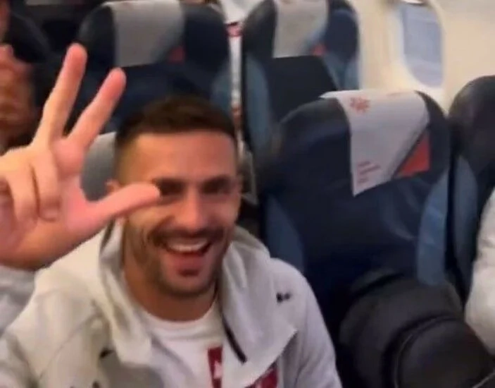 Sırplar için zafer anlamı taşıyan bu işareti Sırbistan A Milli Futbol Takımı'nı taşıyan uçakta kutlama yapılırken