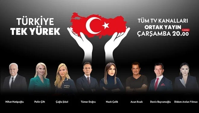 Başta Kahramanmaraş ve Hatay olmak üzere Adıyaman, Gaziantep, Adana, Osmaniye, Malatya, Diyarbakır, Şanlıurfa, Kilis’i etkileyen depremlerin yıkıcı sonuçlarını yaşayan vatandaşlarımız için Türkiye’nin tek yürek olacağı canlı yayın tüm kanallarda aynı anda ekranlara gelecek. Nihat Hatipoğlu, Pelin Çift, Çağla Şıkel, Tümer Doğru, Nazlı Çelik, Acun Ilıcalı, Deniz Bayramoğlu, Didem Arslan Yılmaz moderatörlüğünde yapılacak ortak yayında sanat, iş ve spor dünyasının önde gelen isimleri ve halk depremzedelere destek olacak.