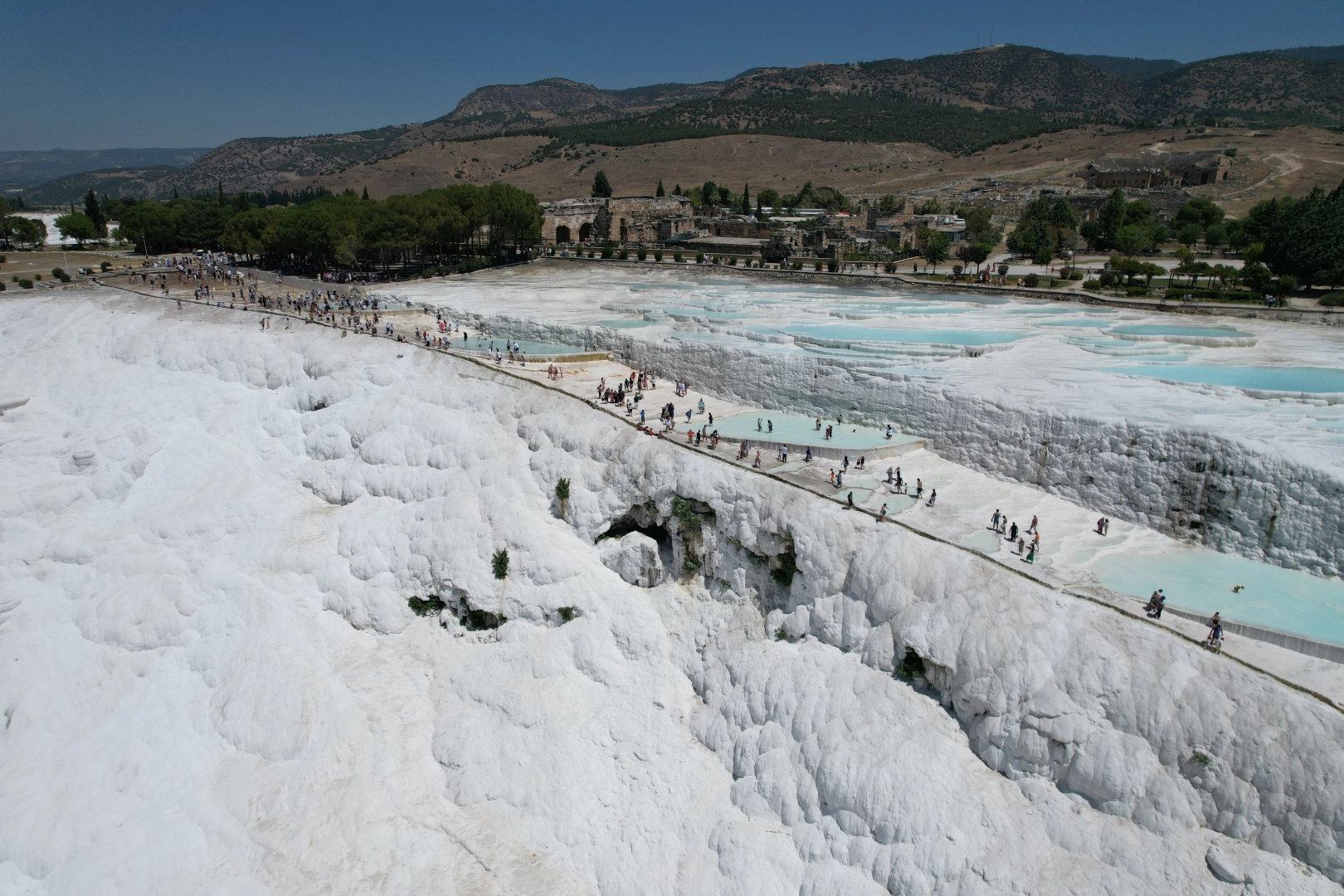 UNESCO’nun Dünya Mirası Listesi’nde yer alan beyaz cennet Pamukkale dünyaca ünlü travertenleri yurt içi ve dışından milyonlarca kişiyi ağırlamaya devam ediyor. Geçtiğimiz 2022 yılının ilk 7 ayında 934 bin 89 yerli ve yabancı turisti ağırlayan Pamukkale, 2023 yılının ilk 7 ayında yüzde 23’lük bir artışla 1 milyon 150 bin kişi ağırladı. Pamukkale travertenlerinde oluşan yoğunluk, havadan dron ile görüntülendi. Turistlerin, beyaz güzellikleriyle göz kamaştıran travertenlere olan ilgisi, etkileyici manzaralarla ortaya konuldu.