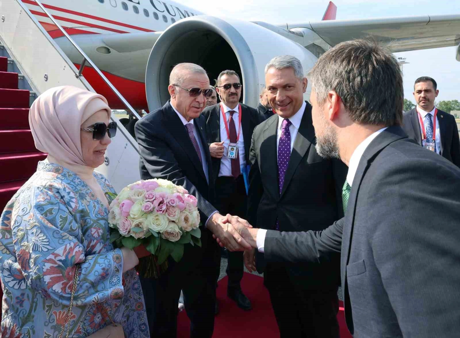 Özel uçak "TUR" ile Budapeşte’ye gelen Erdoğan’a eşi Emine Erdoğan, Cumhurbaşkanlığı İletişim Başkanı Fahrettin Altun ve Cumhurbaşkanı Dış Politika ve Güvenlik Başdanışmanı Akif Çağatay Kılıç da eşlik etti.