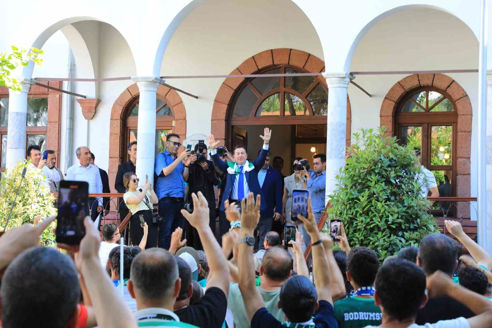 Belediye binası önünde taraftarları karşılayan Başkan Aras, "Şampiyon Bodrumspor" tezahüratıyla coşkuyu artırdı.